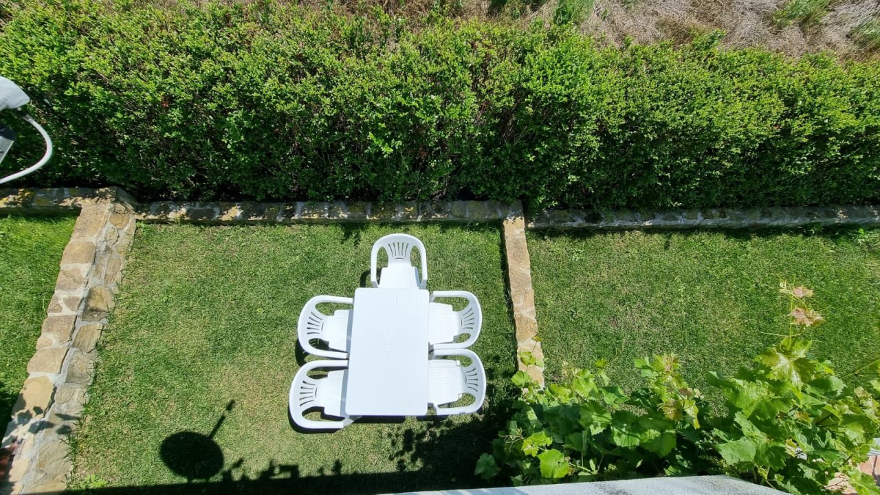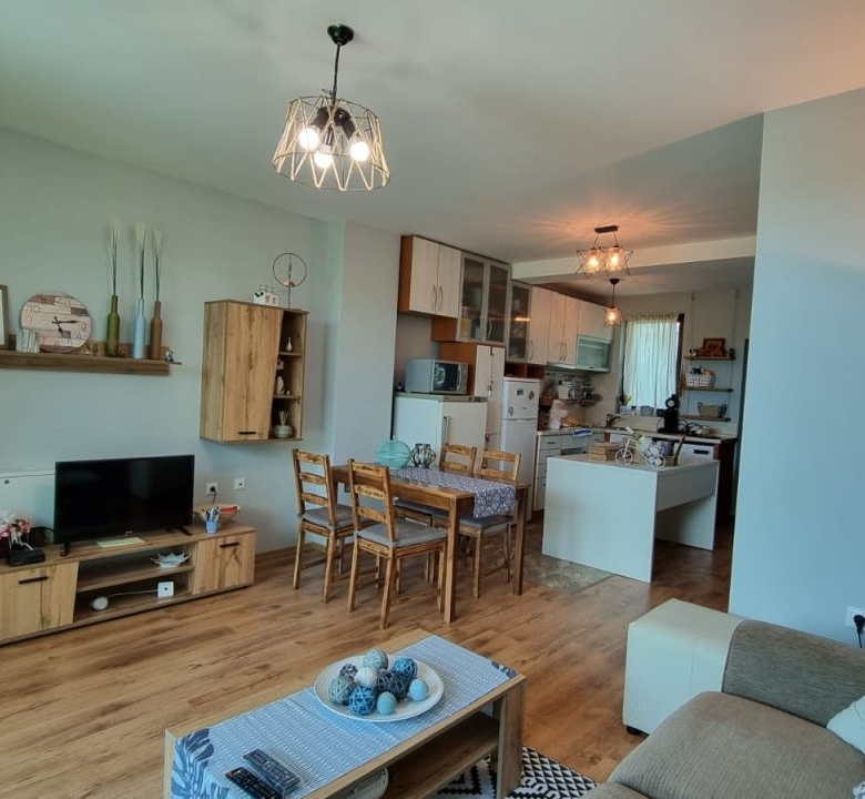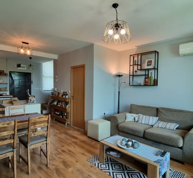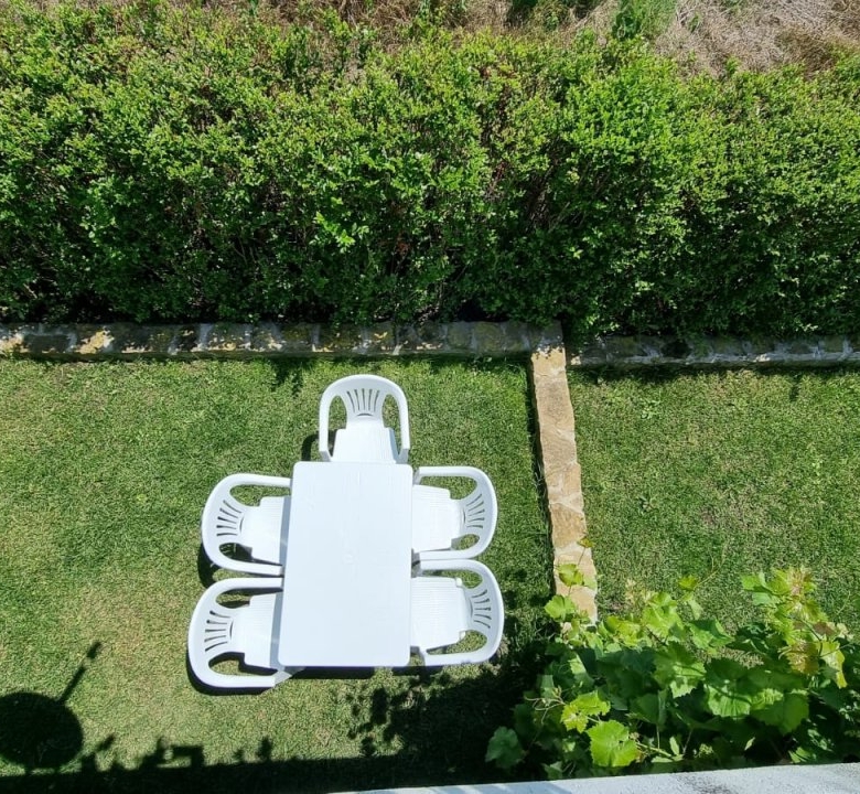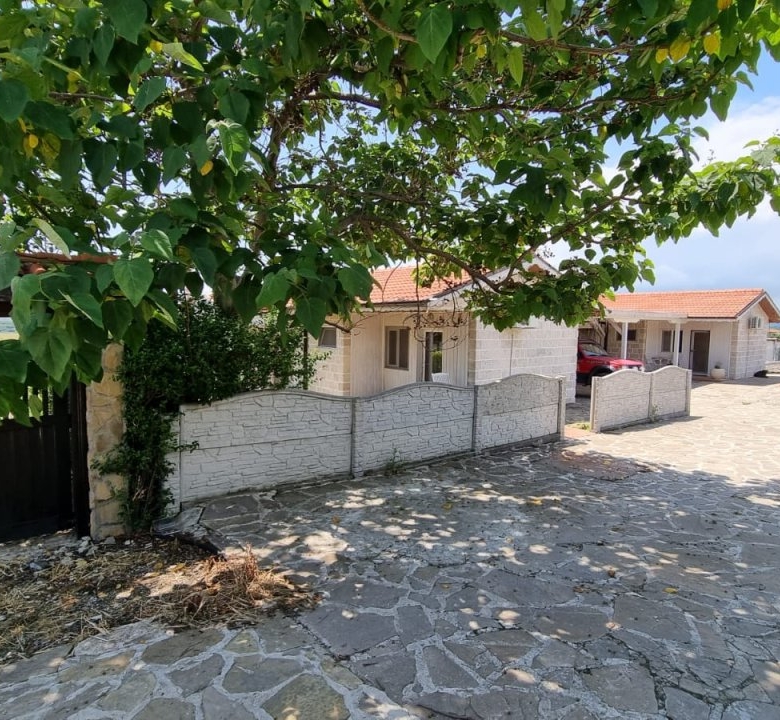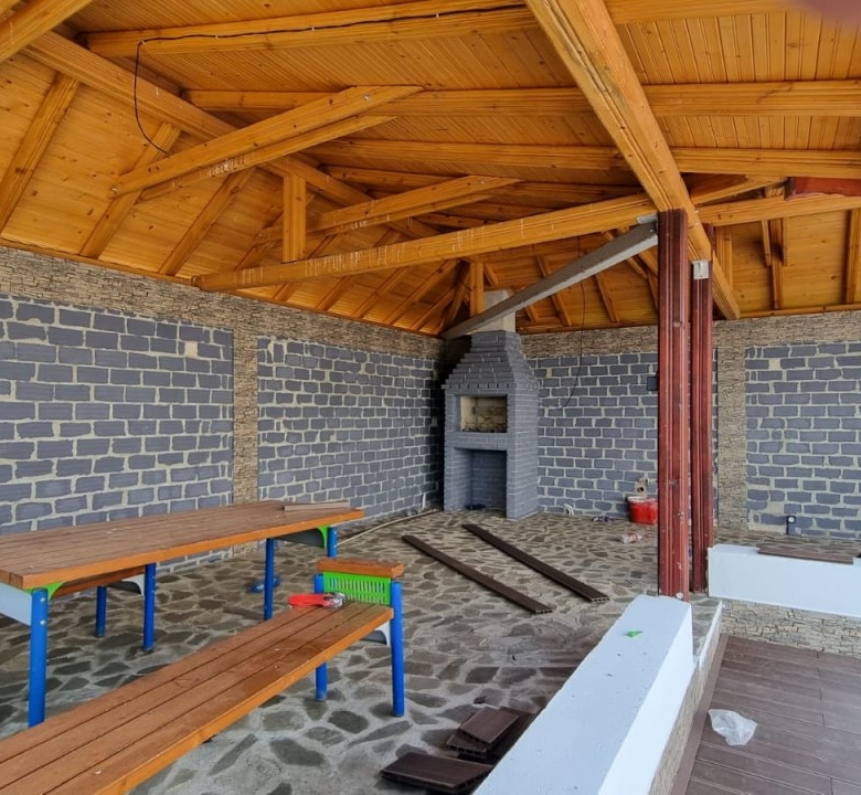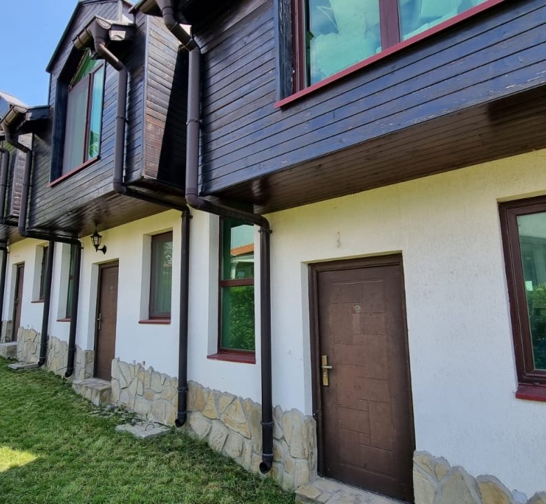 The total area of the houses is 90 m². They consist of: a spacious living room with a kitchenette, a bathroom, and a courtyard on the first floor, and two bedrooms, a bathroom, and a terrace on the second floor. The houses were built in 2015 and have Act 16. They are sold according to your choice – without finishing or with turnkey completion. The house is adjacent to a plot of 123 m², and there is also a communal area with a swimming pool and a gazebo with a grill.