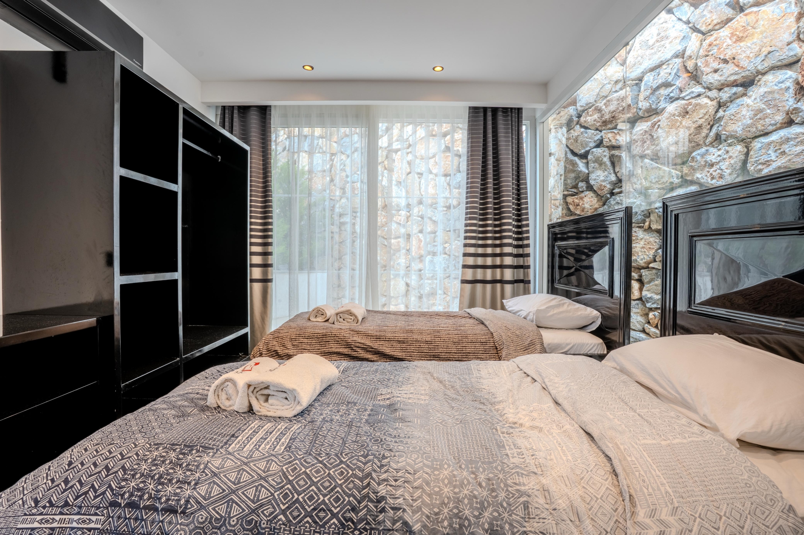 The bedroom follows a soft, restful palette of light grey and beige, creating a soothing atmosphere ideal for relaxation.