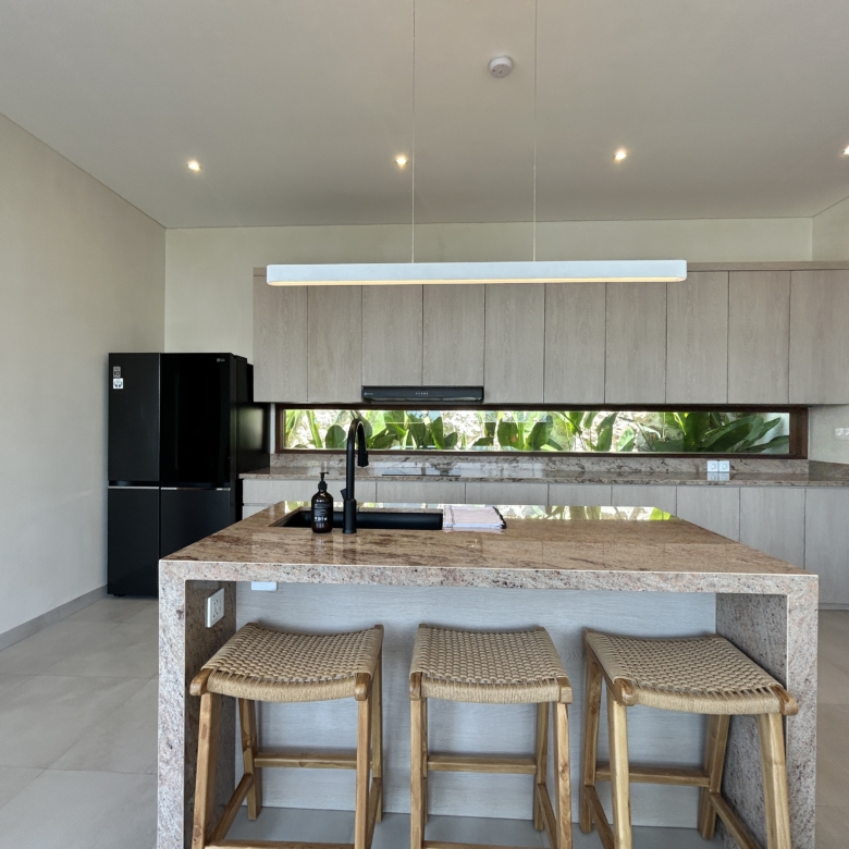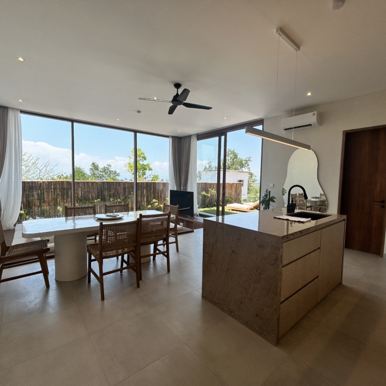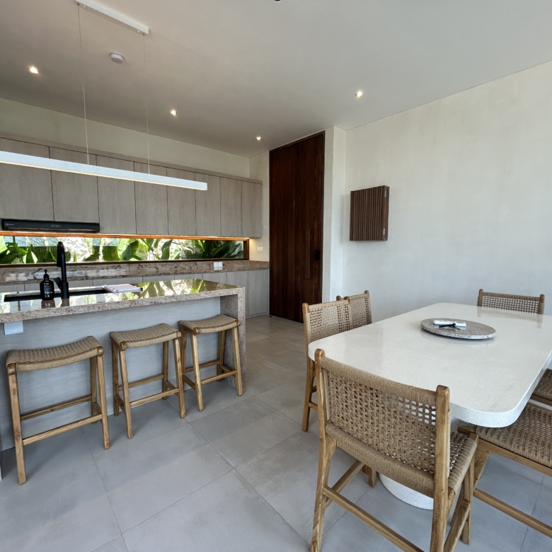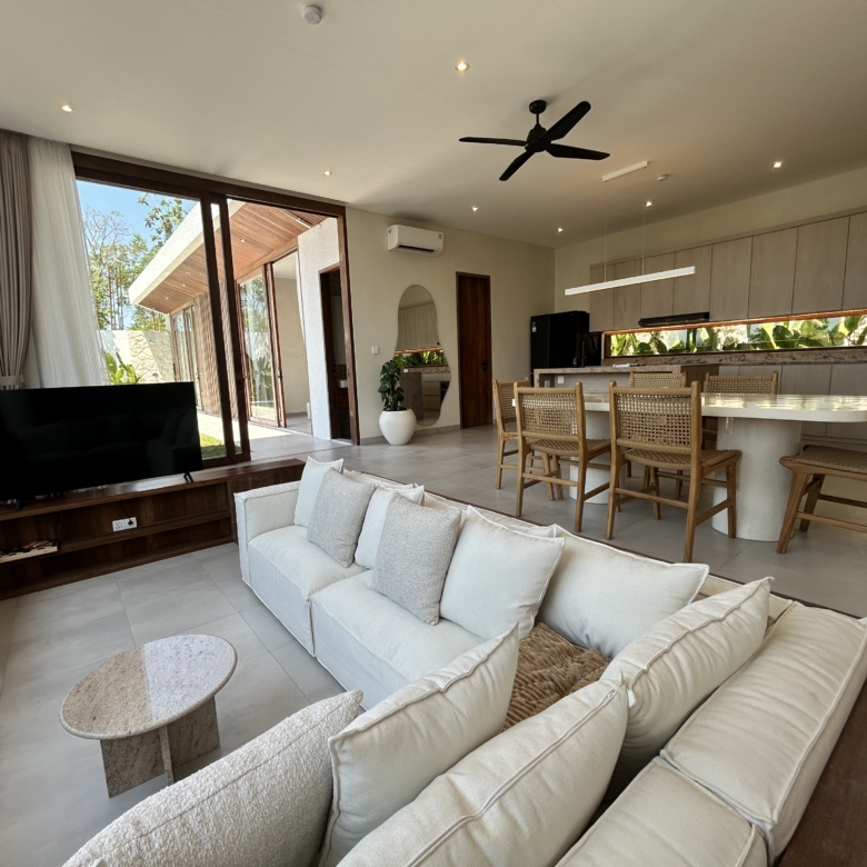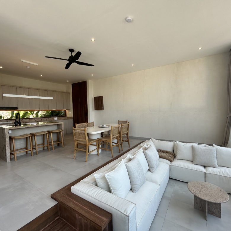 A modern tropical villa designed for high-end living and investment—featuring ocean views, rainwater harvesting, and a rooftop patio for Bali sunsets. Located in the Tourism Zone of Padang Linjong, this villa is surrounded by the area’s best cafés, gyms, beaches, and golf course. Its enclosed living and kitchen areas, elegant design, and lush garden make it a peaceful yet central Canggu retreat.