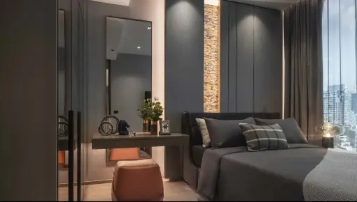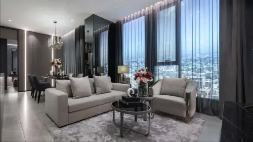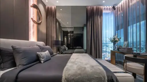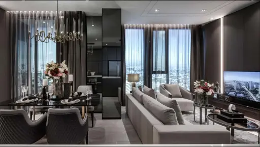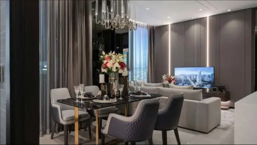 This 131 sqm condo really makes great use of its open-plan design, combining the living and dining areas so you’ll probably spend most of your time here. The large floor-to-ceiling windows flood the space with natural light, and with sheer curtains, you can adjust the atmosphere without losing that cityscape view that stretches out beyond.