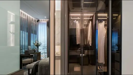 The kitchen is sleek and minimalist, featuring built-in appliances and a white island countertop with a built-in sink, plus under-cabinet lighting for a practical yet stylish workspace. Ample storage includes tall cabinets and a double-door stainless steel fridge. Bedrooms maintain that spacious feel, especially the master with floor-to-ceiling windows and heavy drapes for privacy and light control. The neutral colors and polished floors throughout keep things feeling clean and contemporary.