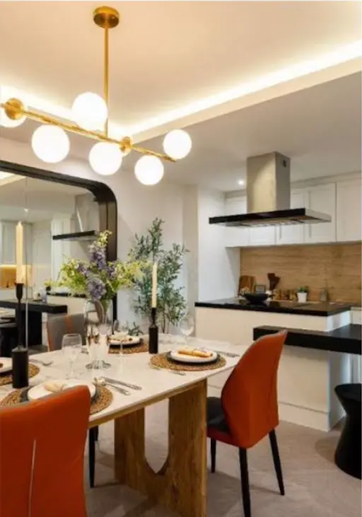 The living room is light and bright, thanks to neutral walls and light wood floors. The standout piece is this orange upholstered sofa, which adds a cozy pop of color, complemented by the round marble-top coffee tables and soft cushions. You’ll probably spend most of your time here relaxing or entertaining.