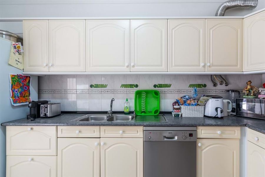 The fully equipped kitchen also has direct access to the terrace, making outdoor cooking and entertaining even more convenient. The apartment features three spacious bedrooms, offering plenty of room for family or guests, along with two modern bathrooms for added convenience.