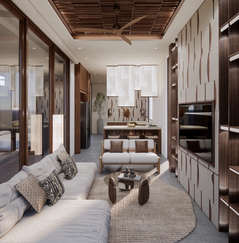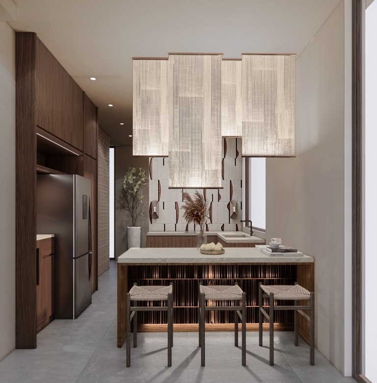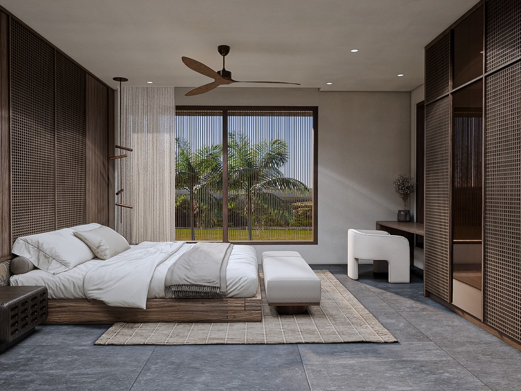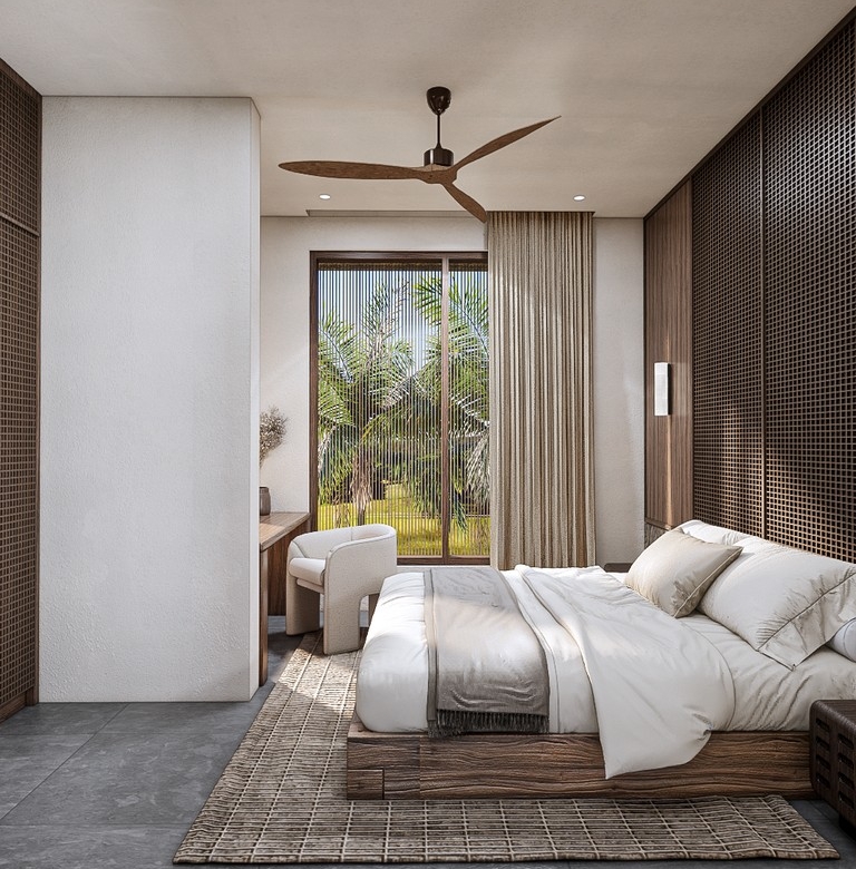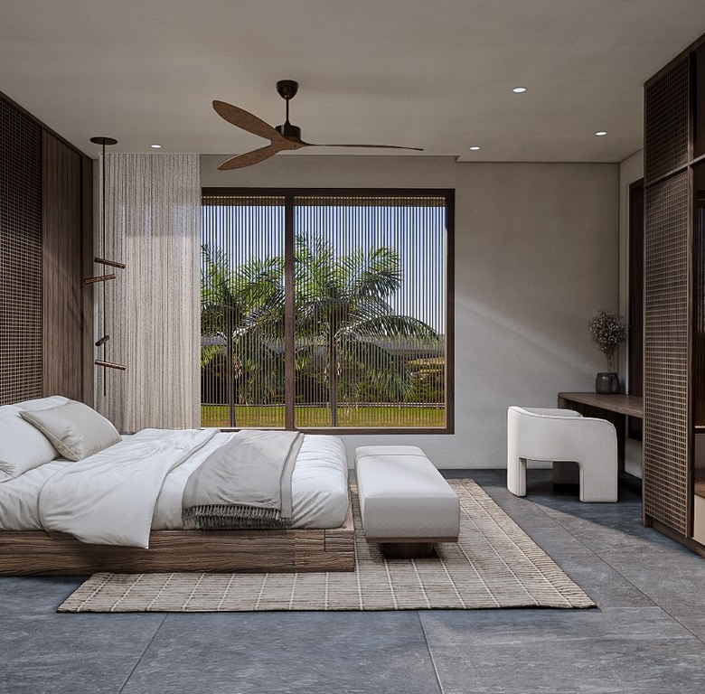 The 2-bedroom villas feature 89.4 m² of building space on 168.5–171.6 m² of land. The 3-bedroom villas offer 113.9 m² on 214.6–216.4 m² of land. Each home is delivered fully furnished, complete with bright living areas, floor-to-ceiling glass, a modern kitchen, ample storage, and serene bedrooms finished in natural tones. Every villa includes a private pool, private car parking, and private bike parking, adding convenience and livability. Ownership is leasehold for 25 years with a guaranteed extension, making it a secure choice for those considering buying property in Bali.