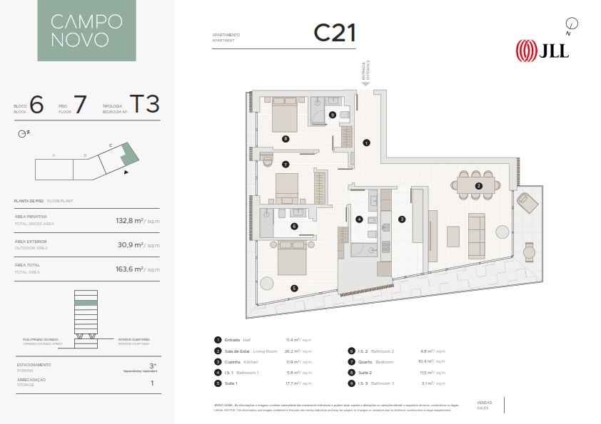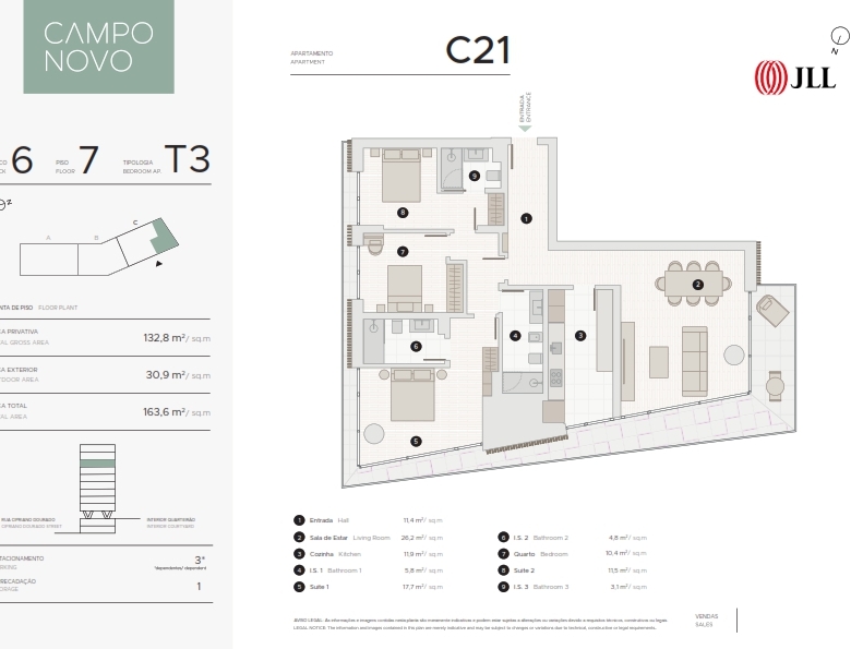 3 Bedroom apartment, new, 132 sqm (gross floor area), 3 parking spaces and balcony, at the Campo Novo condominium, in Campo Grande, Lisbon. All apartments have large areas, plenty of natural light, balconies, parking, and storage areas. .The apartments are extremely comfortable featuring elegant finishes. More than just a set of buildings, Campo Novo is a sustainable ecosystem of its own, with a playground, shops, cafés, restaurants, and offices. It stands out for its luxury proposal in every detail: heated indoor swimming pool, rooftop, parking with charging station for electric vehicles, and a gym. Campo Novo is located in Campo Grande, one of the most central areas of greater Lisbon, with a wide range of shops, 10 minutes from Cidade Universitária and the equestrian centre. It is within a short walking distance of several schools, health clinics and the famous Campo Grande garden. It also benefits from excellent road access, being close to Segunda Circular and a vast transport network, namely the underground station (green and yellow lines). Campo Novo is here to rejuvenate Lisbon with a sustainable and elegant lifestyle.