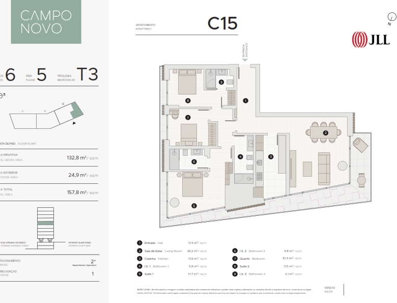 3 Bedroom apartment, new, 132 sqm (gross floor area), 2 parking spaces and balcony, at the Campo Novo condominium, in Campo Grande, Lisbon. All apartments have large areas, plenty of natural light, balconies, parking, and storage areas. .The apartments are extremely comfortable featuring elegant finishes. More than just a set of buildings, Campo Novo is a sustainable ecosystem of its own, with a playground, shops, cafés, restaurants, and offices. It stands out for its luxury proposal in every detail: heated indoor swimming pool, rooftop, parking with charging station for electric vehicles, and a gym. Campo Novo is located in Campo Grande, one of the most central areas of greater Lisbon, with a wide range of shops, 10 minutes from Cidade Universitária and the equestrian centre. It is within a short walking distance of several schools, health clinics and the famous Campo Grande garden. It also benefits from excellent road access, being close to Segunda Circular and a vast transport network, namely the underground station (green and yellow lines). Campo Novo is here to rejuvenate Lisbon with a sustainable and elegant lifestyle.