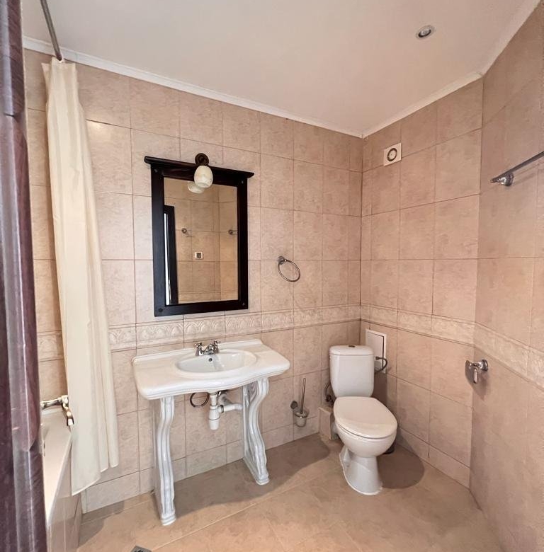 The apartment is a penthouse type and is located on the top (sixth) floor of the building. It consists of a spacious living room with a kitchenette and dining area, three bedrooms, a bathroom with a toilet and shower cabin, a large terrace with a hot tub and sun loungers, and a bathroom with a toilet and bathtub. Each room has access to the terrace, which offers stunning views of the sea, the pool, and the landscaped interior of the complex.