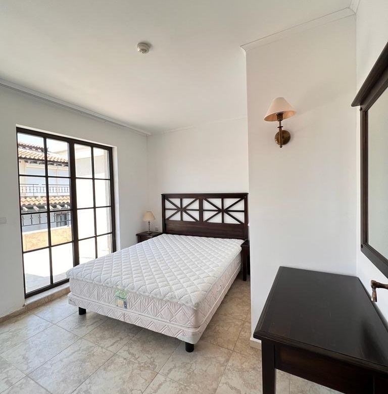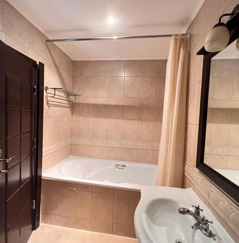 The apartment is of the penthouse type and is located on the top (sixth) floor of the building. It consists of a spacious living room with a kitchenette and dining area, three bedrooms, a bathroom with a toilet and shower cabin, a large terrace with a hot tub and sun loungers, and a bathroom with a toilet and bathtub. Each room has access to the terrace, which offers a wonderful view of the sea, the pool, and the landscaped interior of the complex.