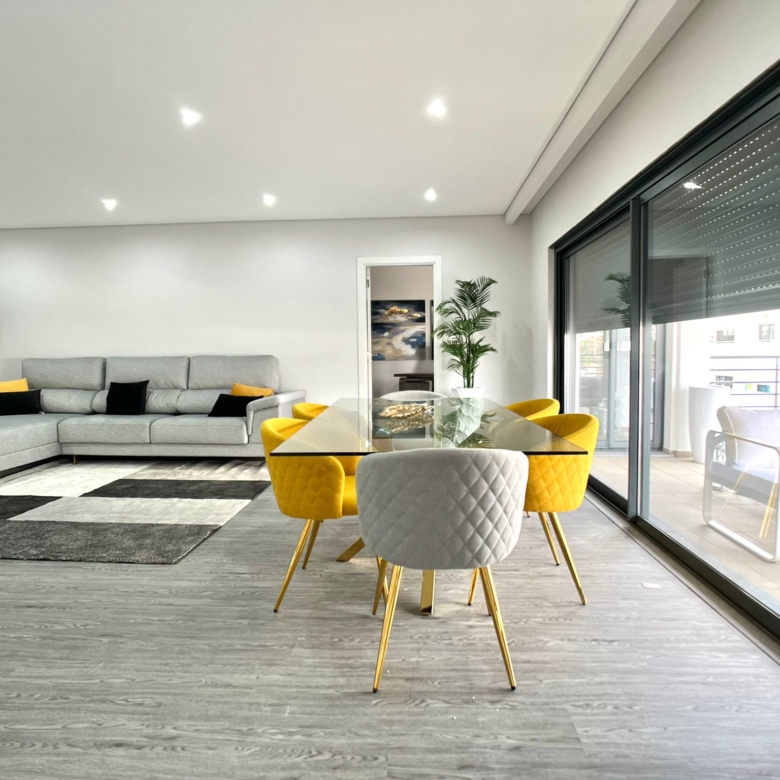 3-bedroom apartment, 129 sqm (gross floor area), new, in a gated community, with two swimming pools, balconies, and one parking space in Quelfes, Olhão, Algarve. It comprises a living room, an integrated and equipped kitchen, three bedrooms with wardrobes, one of them en suite, a pantry, and a storage room in the basement. Modern architecture gated community. Located in Olhão, one of the most central and charming places in the Algarve region. It stands out for the balance between the modern design of the buildings and the natural environment of the gated community gardens. The façades create a dynamic atmosphere and blend into a versatile garden that allows each person, on their own or in a group, to make the most of their space or simply to watch, from the balcony, the changes of the scenery throughout the day or seasons. Located 15 minutes from the Olhão marina and 20 minutes from the Olhão riverside area and centre. 5-minute driving distance from the boats to the islands of Faro and Olhão and from the Bernadette Romeira International School. It is also 15 minutes from Faro Airport, 25 minutes from Quinta do Lago Laranjal Golf Course, and a two and a half-hour drive from Lisbon.