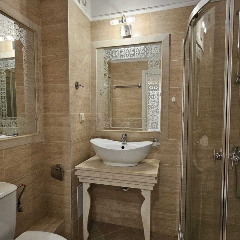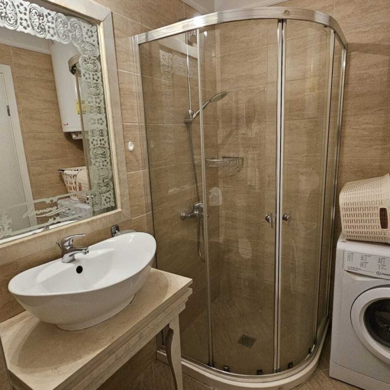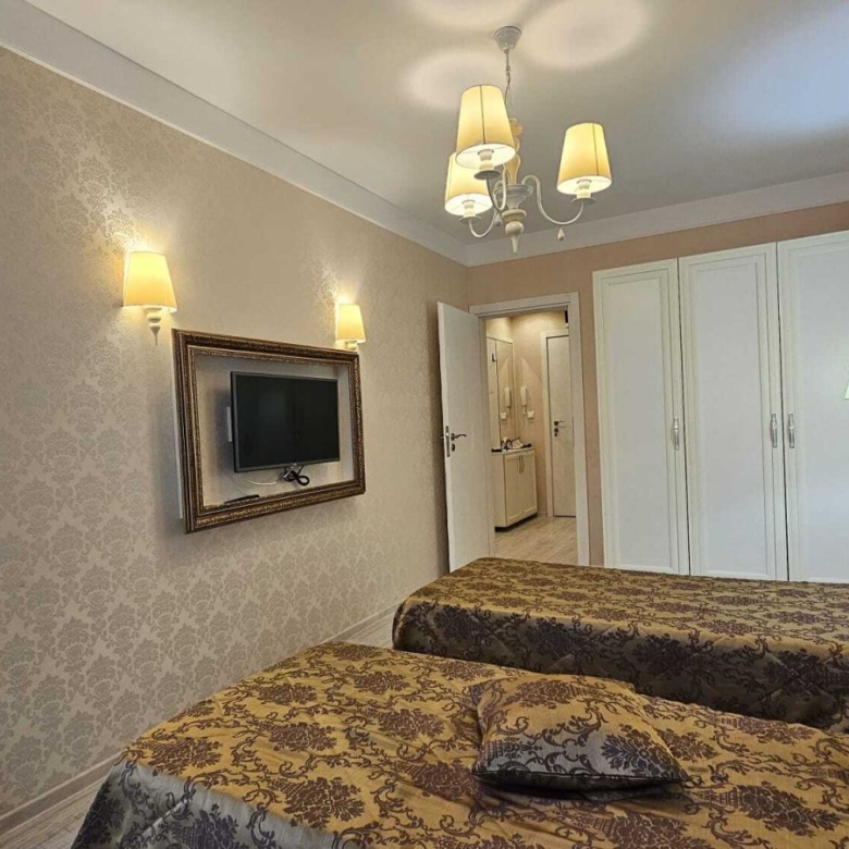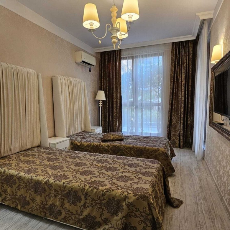 The complex is conveniently located just 400 meters from the beach, in a quiet and peaceful area, yet close to the resort center with its variety of entertainment options. An undeniable advantage of the complex is its spacious, landscaped area. It features a large swimming pool with a mini-water park for children, playground, pool bar, outdoor and indoor relaxation areas with pavilions, hammocks, and resting spots, dancing fountains, reception, and a stylish spa center with an indoor pool, which includes:
