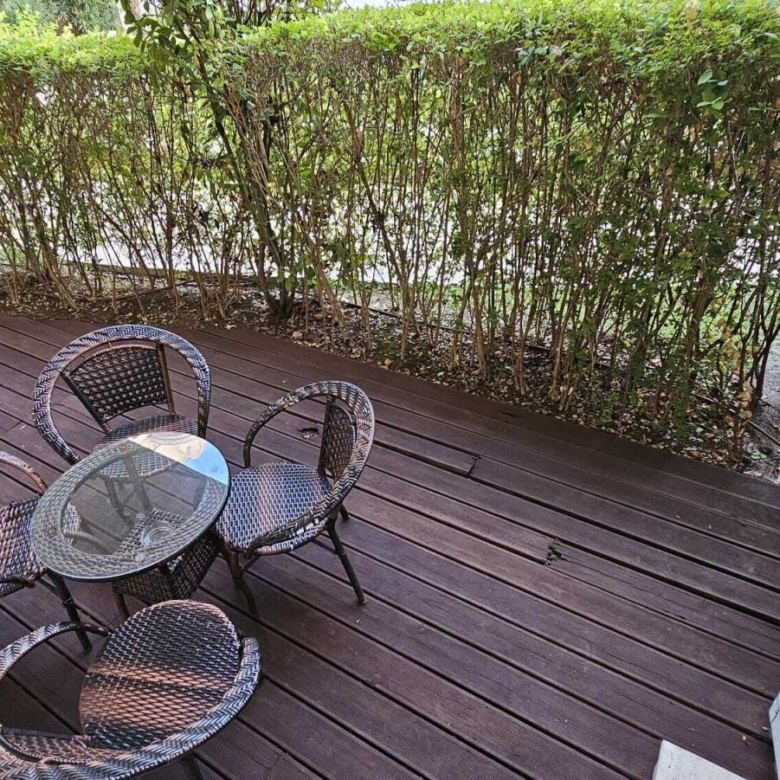The terrace features high-quality patio furniture with views of the grounds.