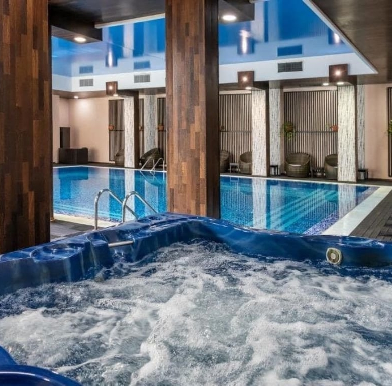 Heated indoor pool & spa center featuring sauna, steam bath, gym & massages