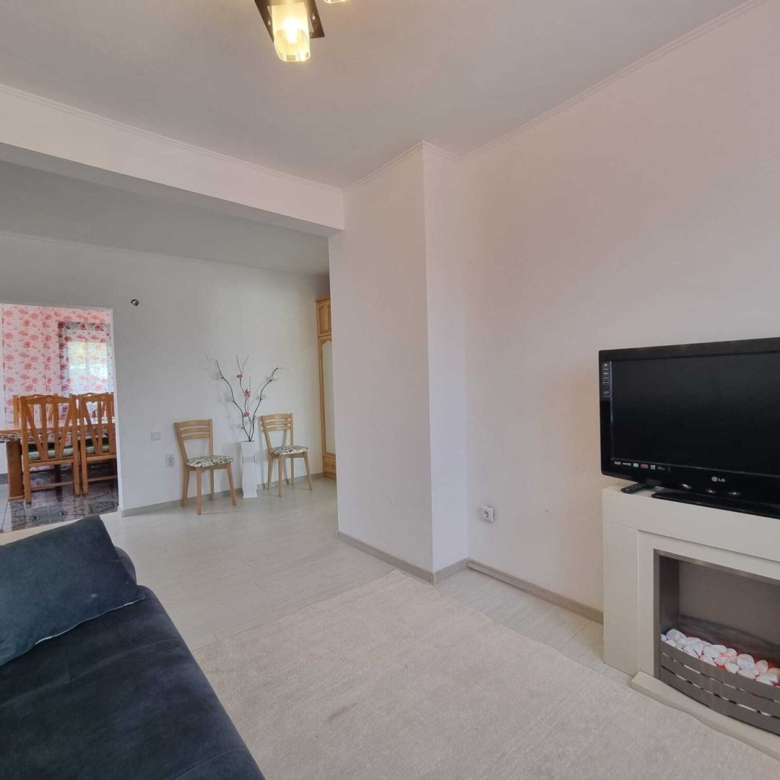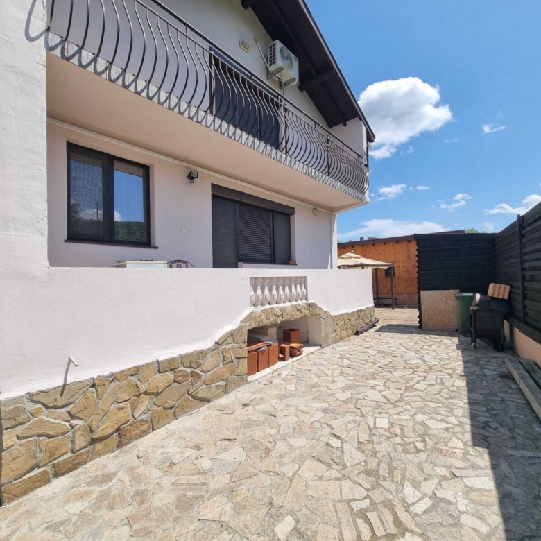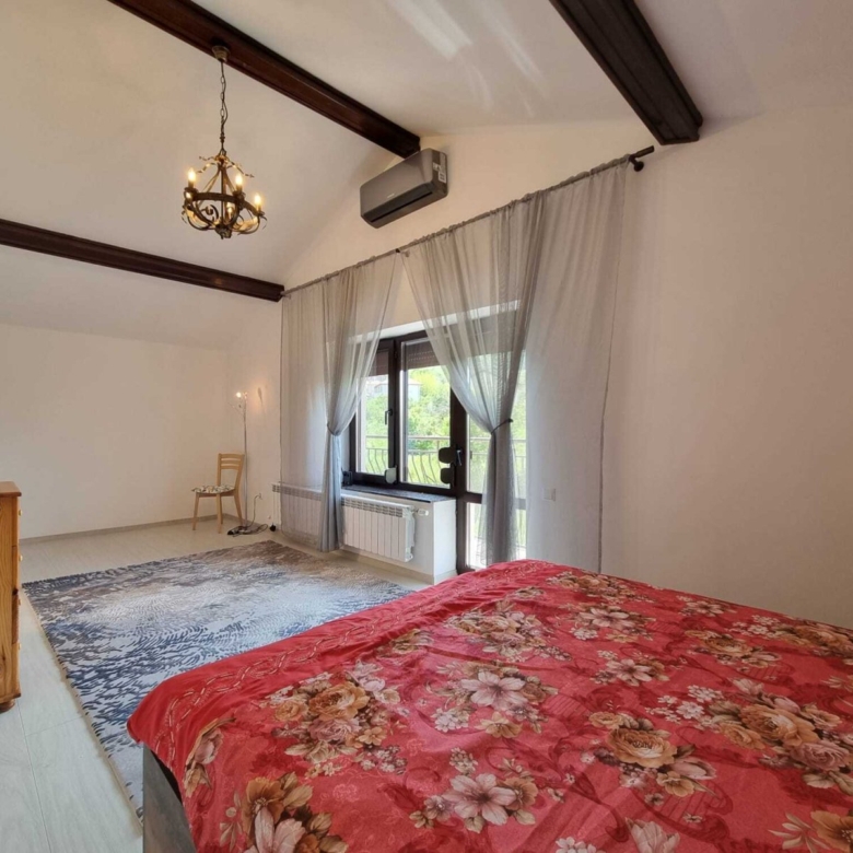 The house is located at the foot of the mountain, with a lovely panorama. The area of the house is 162 m², excluding the basement. On the ground floor, there is: an entrance hall, a living room with an electric fireplace, a kitchen, a dining room with access to a large terrace, a bedroom, and a bathroom with a shower. On the second floor: a hallway, 2 bedrooms, one of which has a dressing room and a terrace, and a bathroom with a shower. The basement contains a heating boiler and a new heating boiler. The house is in excellent condition, equipped with new furniture, appliances, and air conditioning, and is fully ready for comfortable living! Each room is equipped with a radiator. Internet, television, security system, and video surveillance are installed. Water and electricity are centralized.