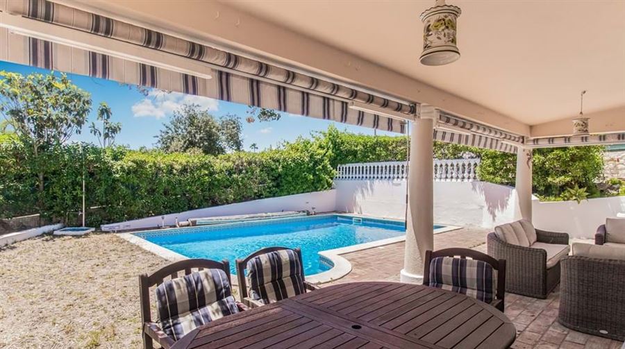 Step outside, and youll find a large private pool surrounded by a manicured lawn, a jacuzzi, and an inviting outdoor BBQ and dining area. The covered terrace, complete with comfortable outdoor sofas and a dining table for six, includes retractable awnings for thermal comfort and shade, taking full advantage of the Algarves all-day sun.