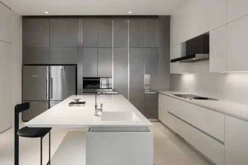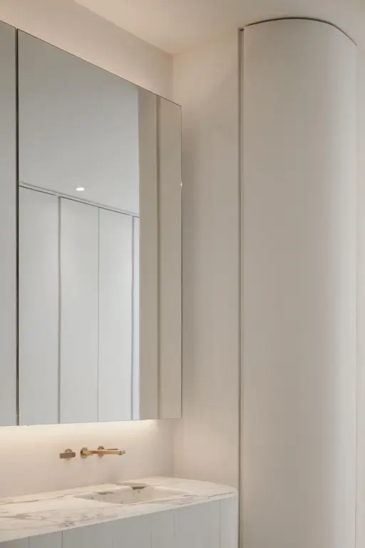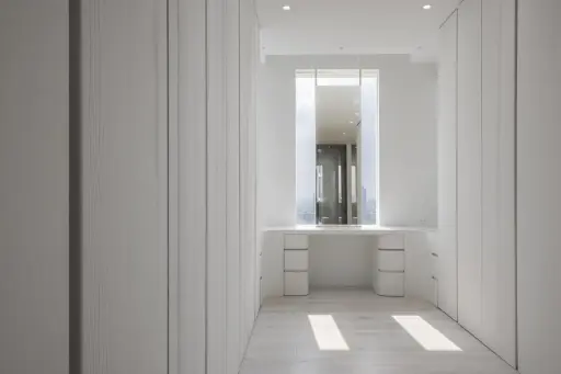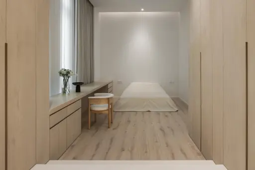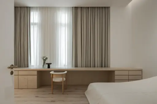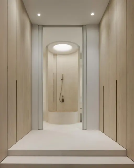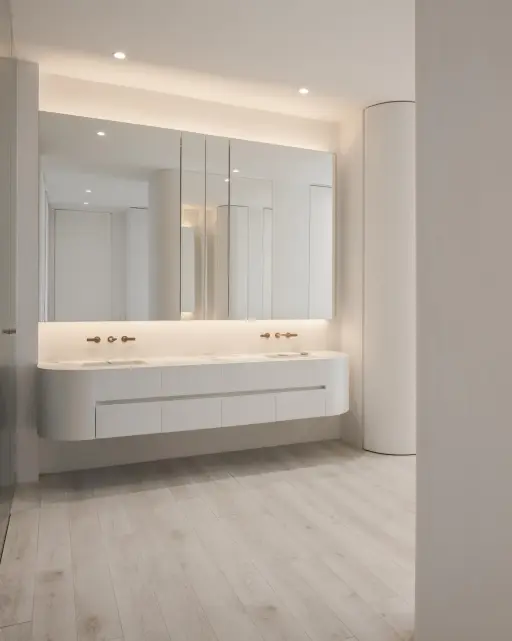 The overall vibe is modern minimalist with a clean, neutral palette—think white walls, light wood flooring, and smooth, polished surfaces. Built-in wooden closets and work desks blend seamlessly into the space, keeping things clutter-free. The curved walls, arched doorways, and ceiling recesses add subtle architectural interest without feeling overwhelming.