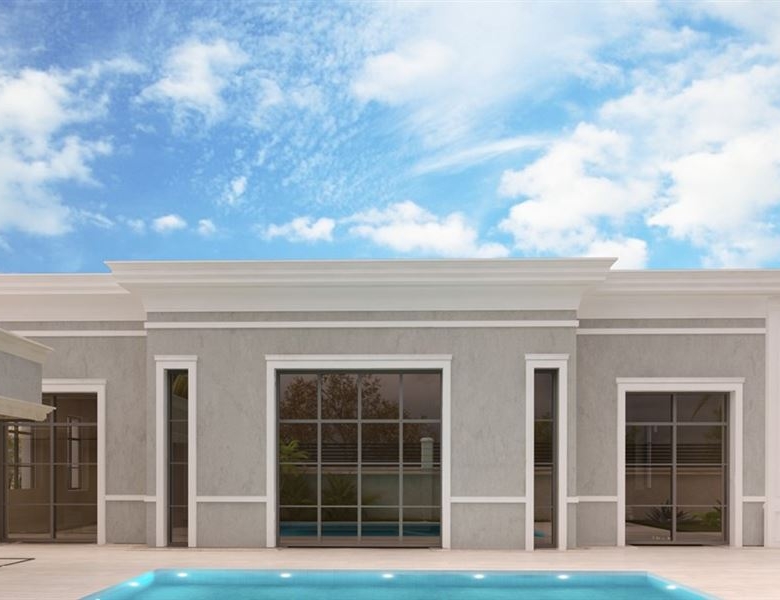 Outside, the villa boasts a large, heated swimming pool, an outdoor kitchen with BBQ and a dining area, creating an idyllic space for entertaining guests while enjoying al fresco dining. The surrounding landscaped gardens are thoughtfully designed to be low maintenance, providing an aesthetically pleasing backdrop to the property.
