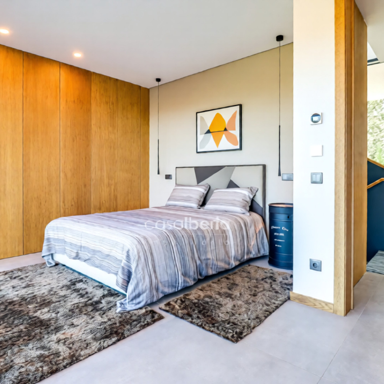 On the ground floor, the elegant entrance hall leads to a spacious living and dining area with direct access to the outdoor terrace, the heated pool, and a modern kitchen equipped with Bosch appliances and a pantry, with access to the BBQ area and garden. This floor also includes a guest bathroom, a large en-suite bedroom, and a storage area.