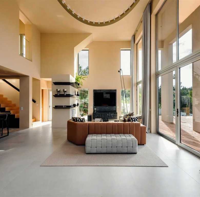 You have access to the main level via the staircase or the lift, where you are greeted with a spacious living area with six meter high celings and fireplace with french doors that guide you out to the terrace and the ten pool.