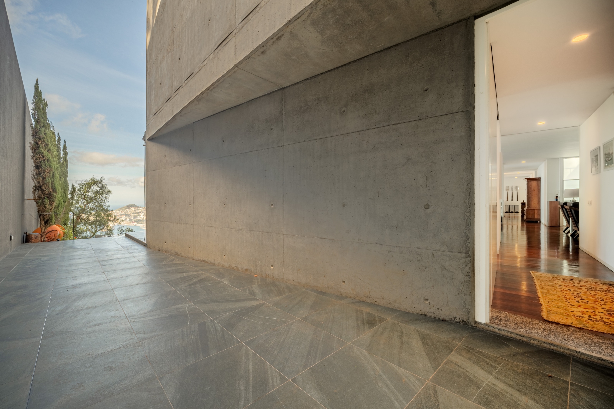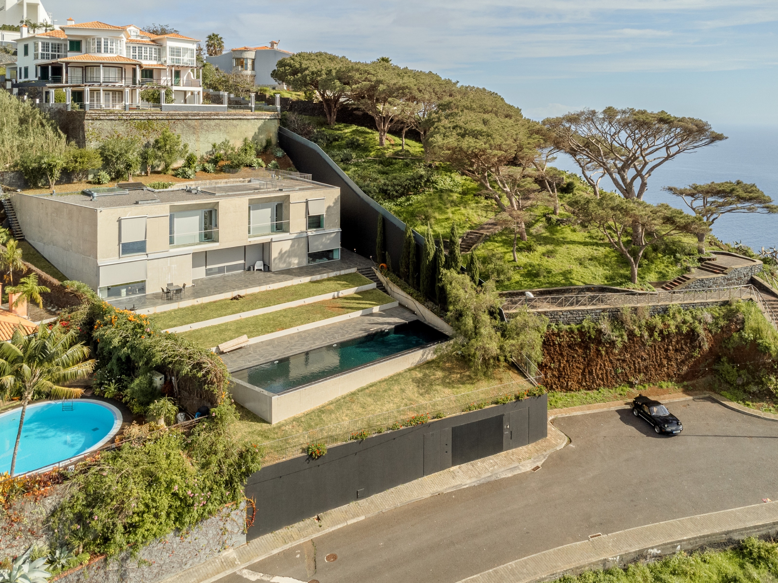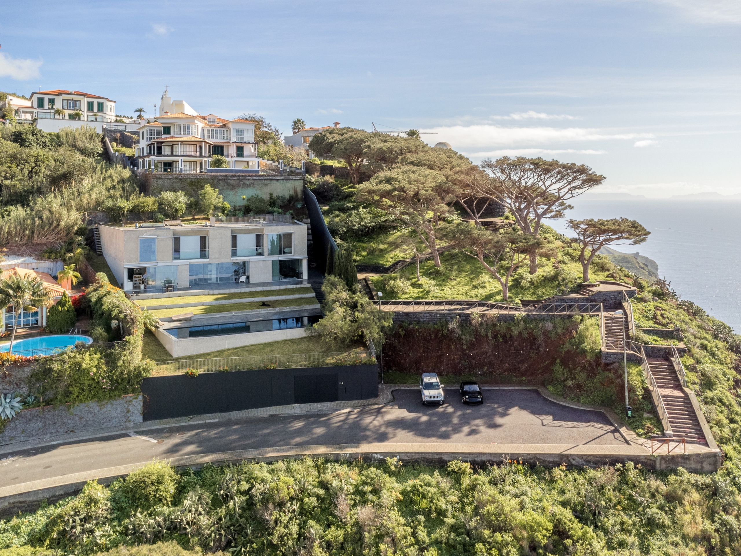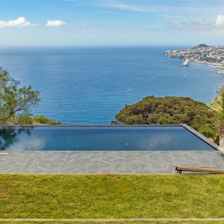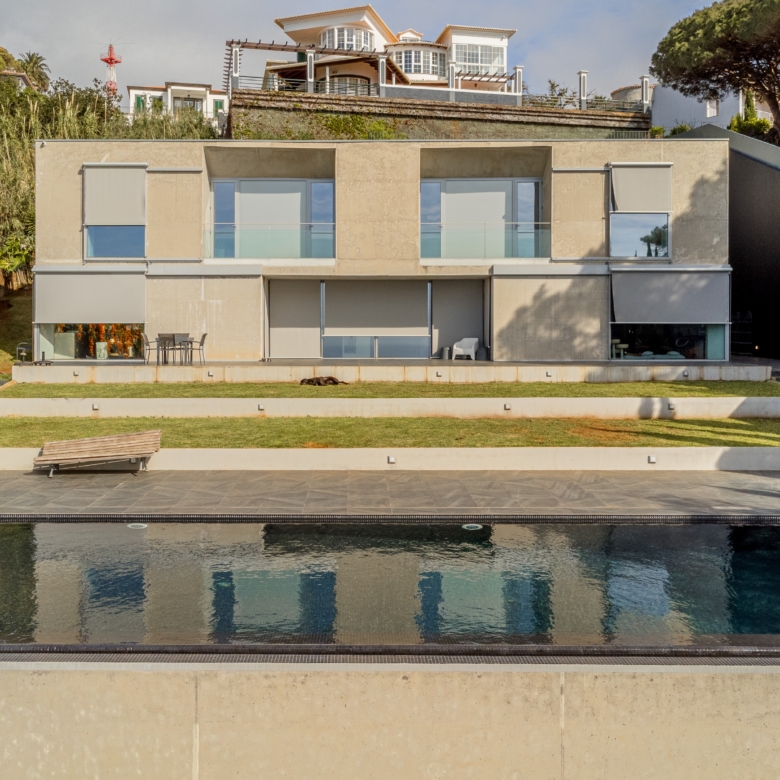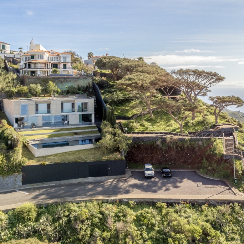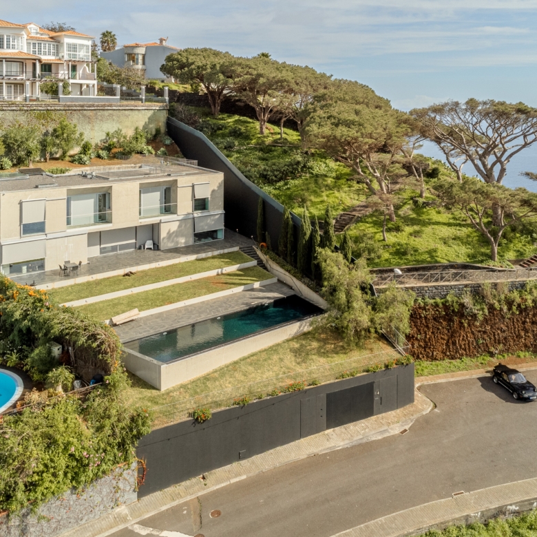 4-bedroom villa with 903 sqm of gross construction area, a garden, swimming pool, and stunning front-facing sea views, along with a privileged panoramic view over the city’s bay. Set on a 1,230 sqm plot in São Gonçalo, Funchal, Madeira.Designed by the renowned architect Paulo David, this contemporary-style villa is spread over three floors.On the ground floor, the living room has two openings leading to the garden and pool area, divided into two distinct spaces: a lounge and a dining area, with direct access to the fully equipped kitchen, which features an island and a dining area, also opening onto the garden. This floor also includes a pantry, laundry room, office, TV room, entrance hall, and a guest bathroom.The first floor comprises four bedrooms: three suites and a master suite, all with walk-in closets, private balconies with sea views, and abundant natural light.The lower ground floor (-1) features a multipurpose room, gym, wine cellar, bathroom serving the pool area, storage room, garage, technical room, and waste disposal area.This villa stands out for its architecture and robust engineering, using noble materials and high-quality finishes, offering a unique and incomparable character. Defined by its clean lines, exposed concrete elements, and large window openings, it seamlessly integrates indoor and outdoor living spaces.Located just a 5-minute drive from Palheiro Golf, 10 minutes from Cristiano Ronaldo Airport, the Private Hospital, Funchal city center, the Marina, nurseries, private and public schools, and leisure facilities such as gardens, tennis, and padel courts. It is also 15 minutes from Santo da Serra Golf Club.