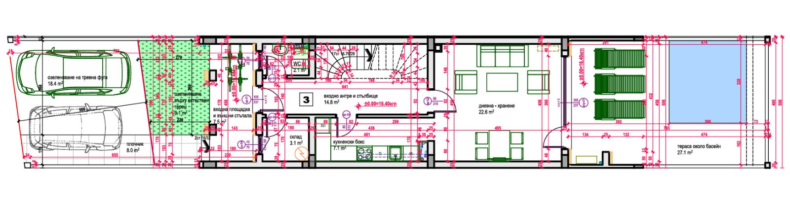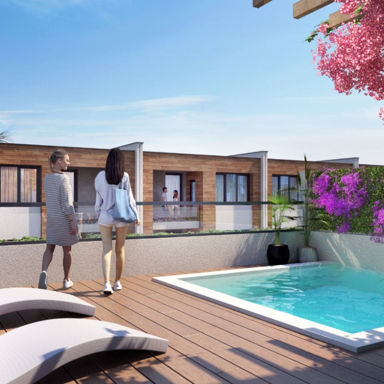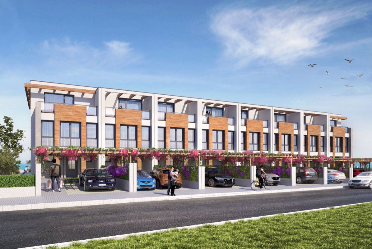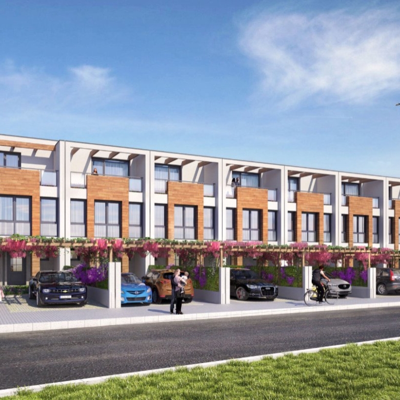 Access to your new house is directly from the street. There is a private courtyard enclosed by fences. The entrance to the residential building is designed for two cars. Climbing vegetation covers pergolas over the parking areas and along the fences that separate the courtyards.