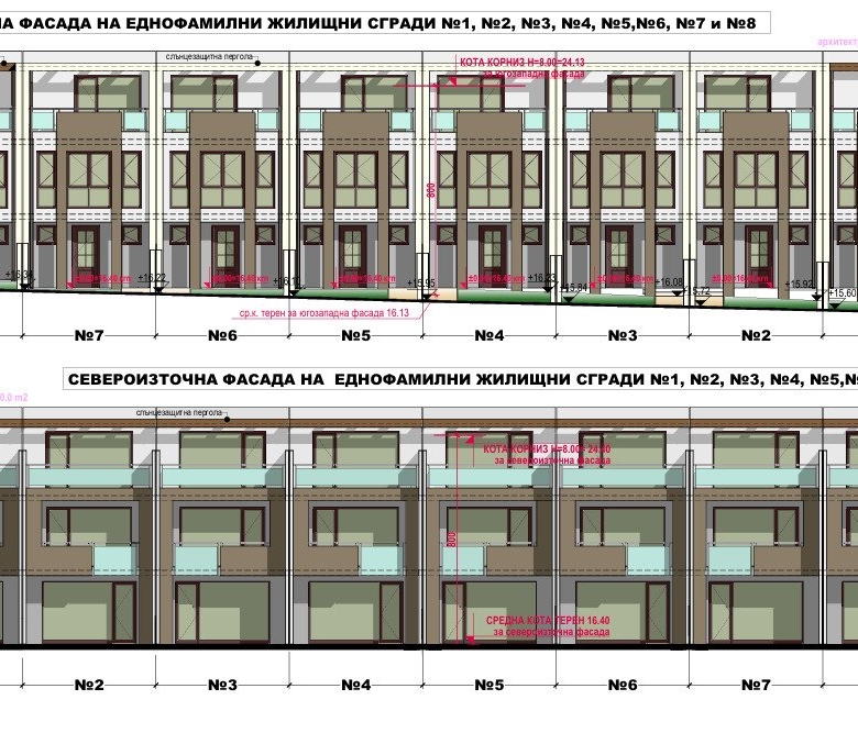 The landscaping is natural—climbing vegetation on pergolas over the parking areas and on fences that separate the courtyards. The property is accessible via a street planned in the development detail plan towards the southwest and two pedestrian alleys.