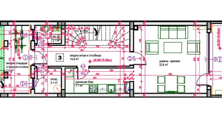 Near the complex, there are a school, a kindergarten, restaurants, and public transport stops. The houses are two-story and three-story buildings, each with its own separate garage or parking space with a capacity for two cars. On the ground floor of each house, there is a living room and a kitchen with a dining area, separated into corners, as well as a storage room and a bathroom with an entrance hall. Parking spaces are available in the southwestern enclosed courtyard.