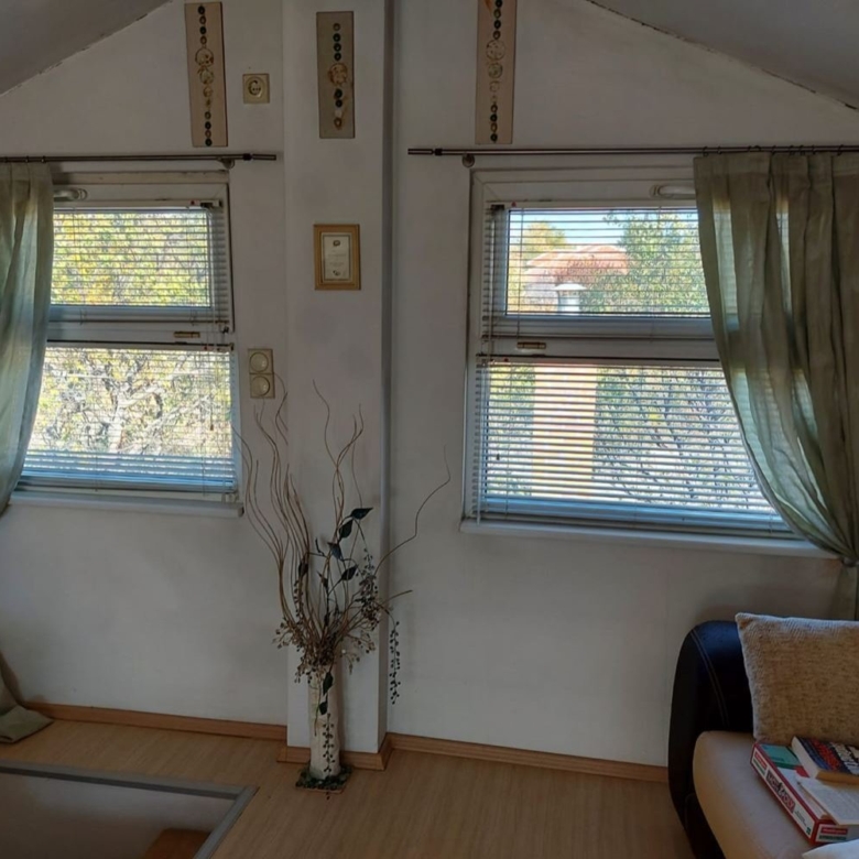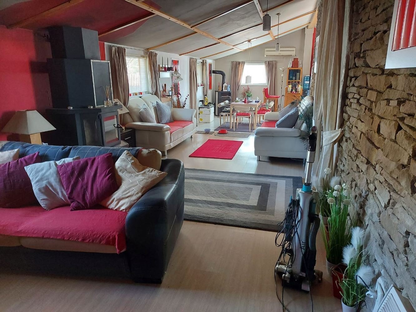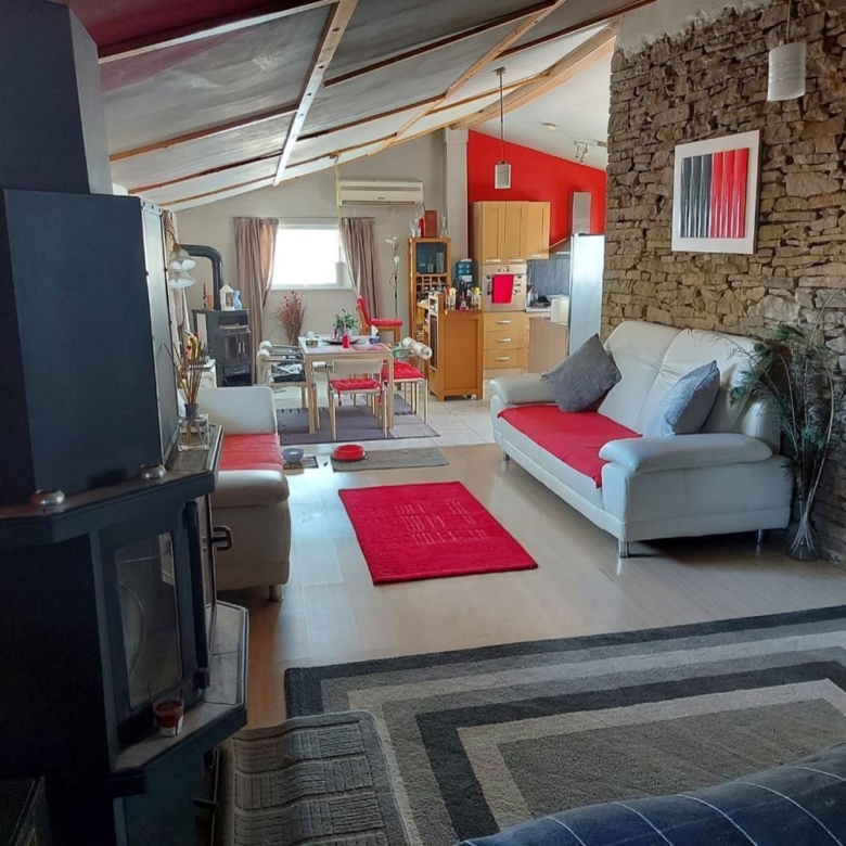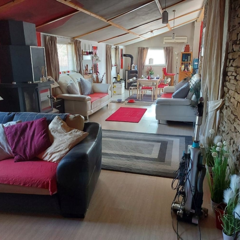 The house is heated with air conditioners and also has three wood-burning stoves. It has been completely renovated with new, high-quality materials. The yard has space for parking three cars, and the property is adorned with many fruit trees.