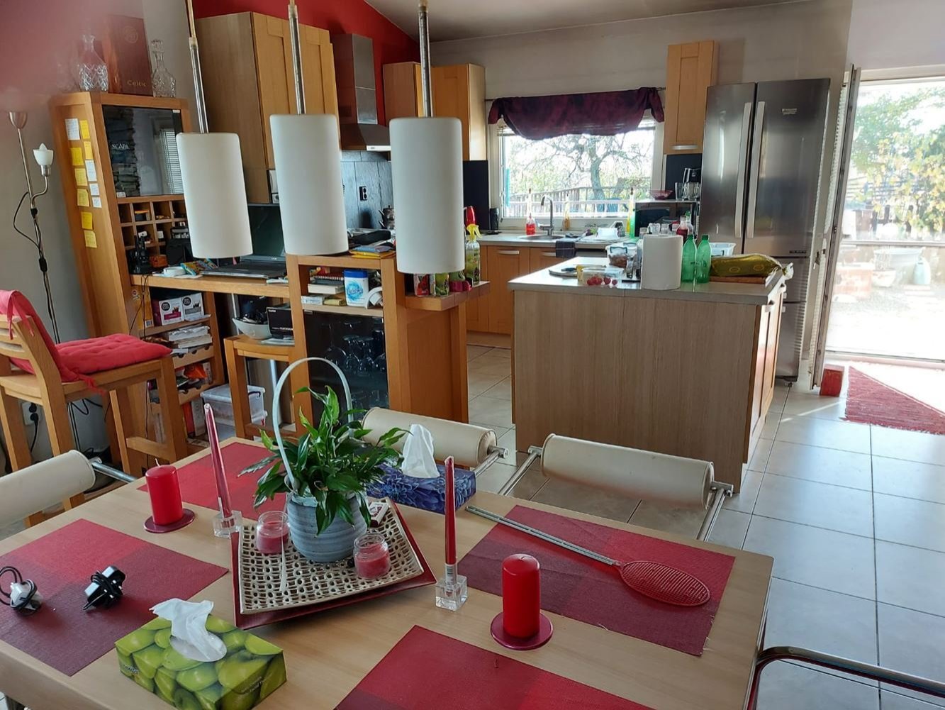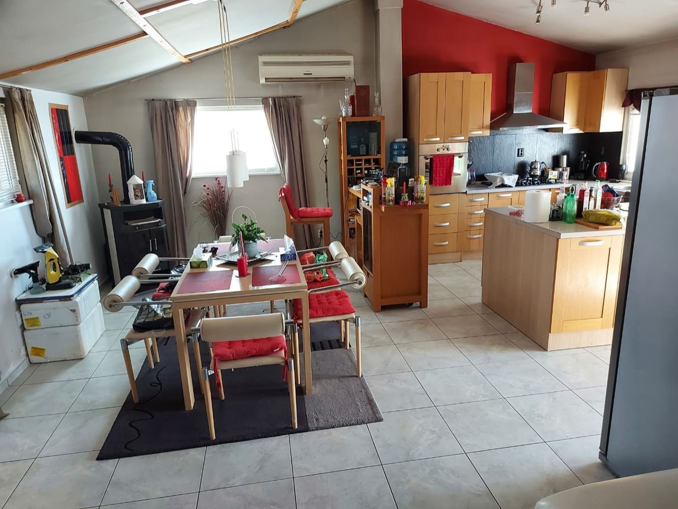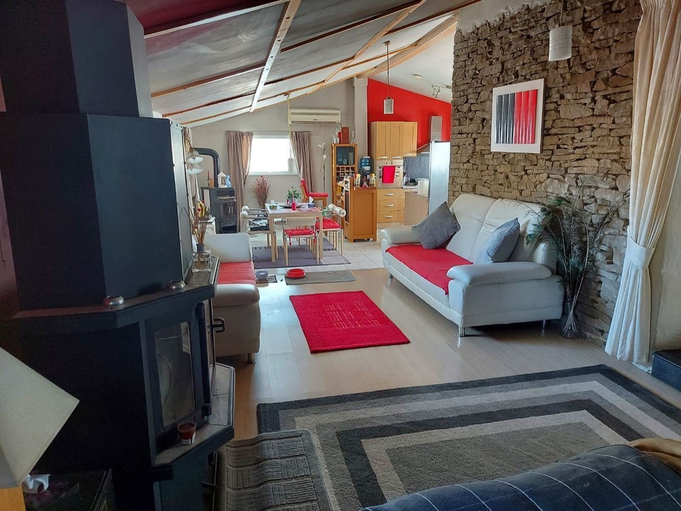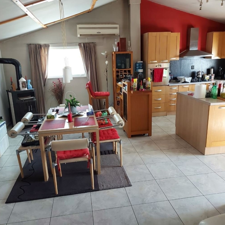 It is built on a 1,200 m² plot and offers a total living area of 385 m². The ground floor includes a spacious dining room with a kitchen, three bedrooms, a living room, an office, a veranda, and a bathroom with a toilet. On the upper floor, there is a master bedroom with a terrace, offering a unique panoramic view of the nearby hills.