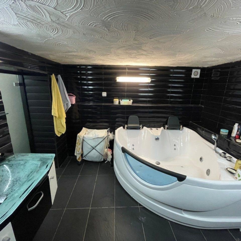 The basement houses a luxuriously equipped bathroom with a massage bathtub and toilet, as well as a fitness room with an integrated fireplace. This space can easily be transformed into a cozy tavern if needed—perfect for guests or family celebrations.