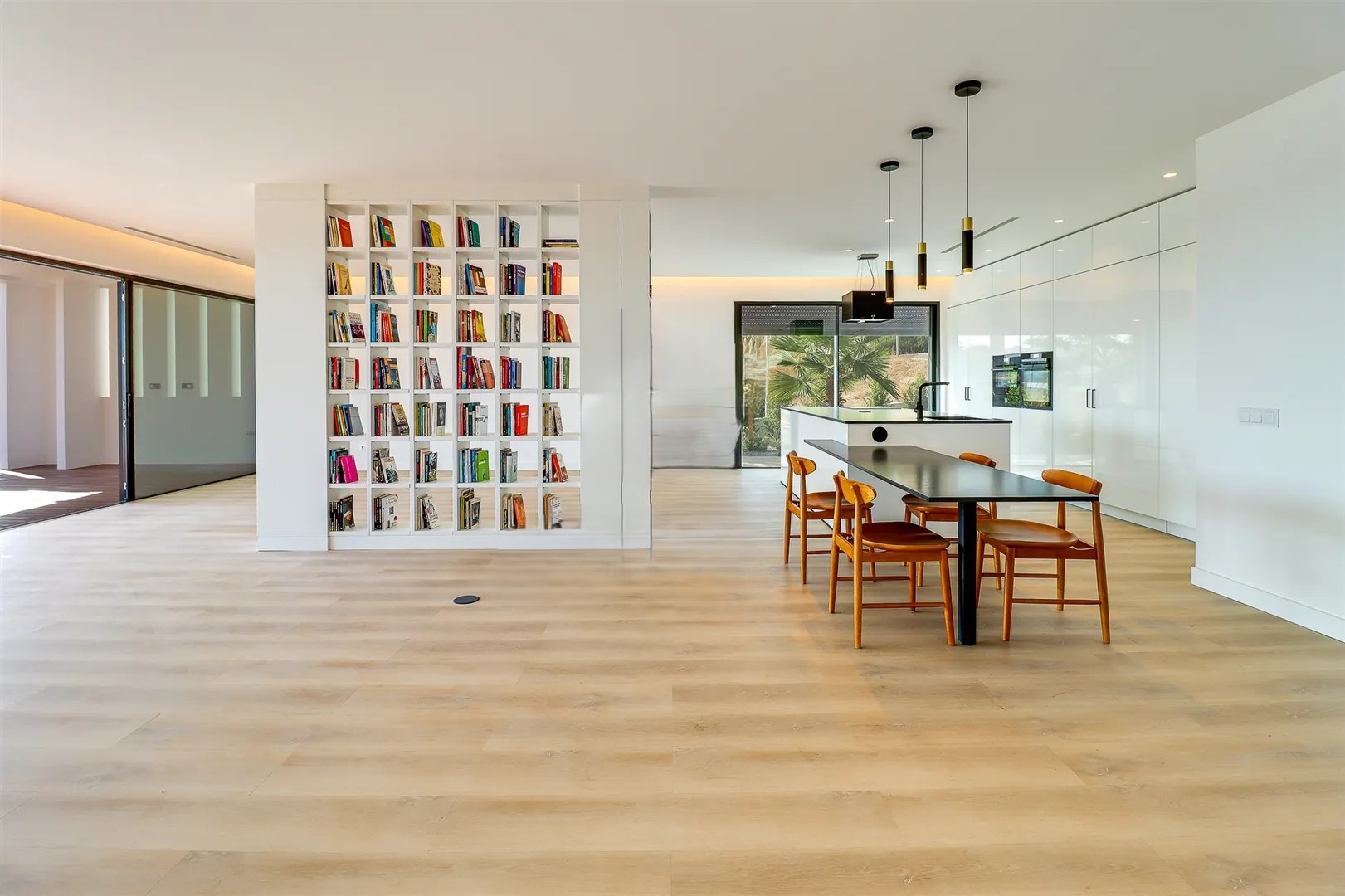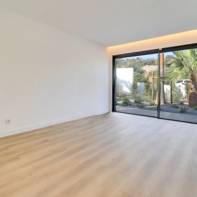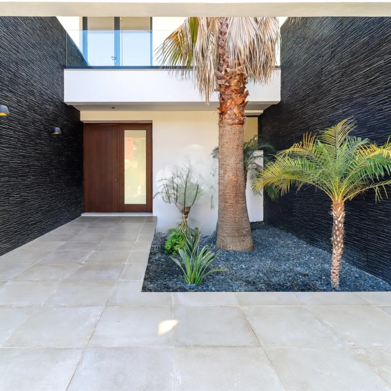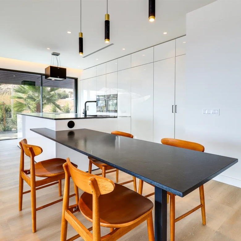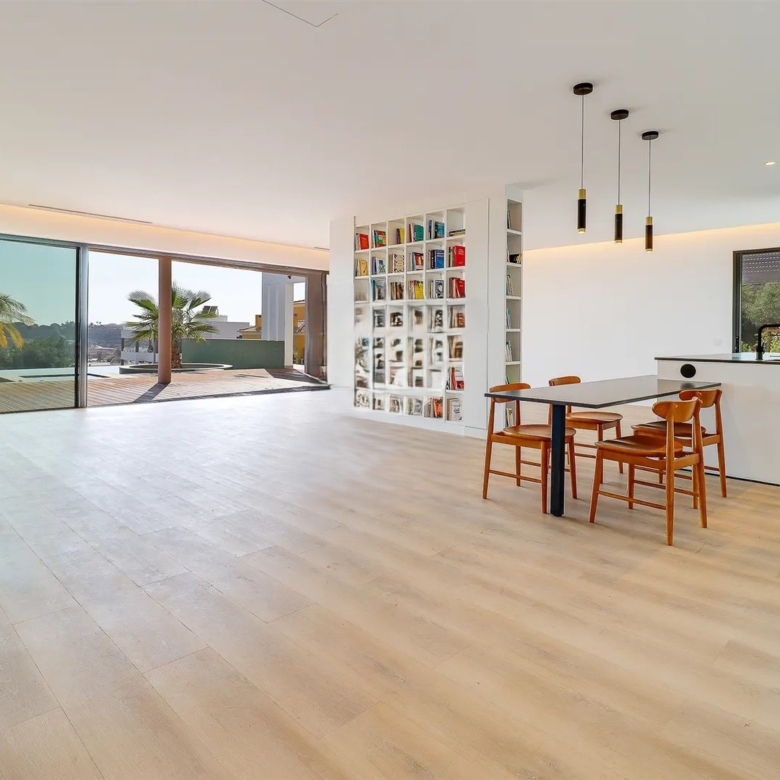 It has an imposing entrance to the social area, with a living and dining room and kitchen equipped with an open-plan island, very spacious, with natural light thanks to the glass windows that extend from floor to ceiling, thus offering a panoramic view over the sea and the tropical garden, eliminating any barrier between the interior and the exterior. This perfect fusion between the spaces allows for a continuous experience, where the huge terrace, the pool and the jacuzzi become a natural extension of the interior area of the house.