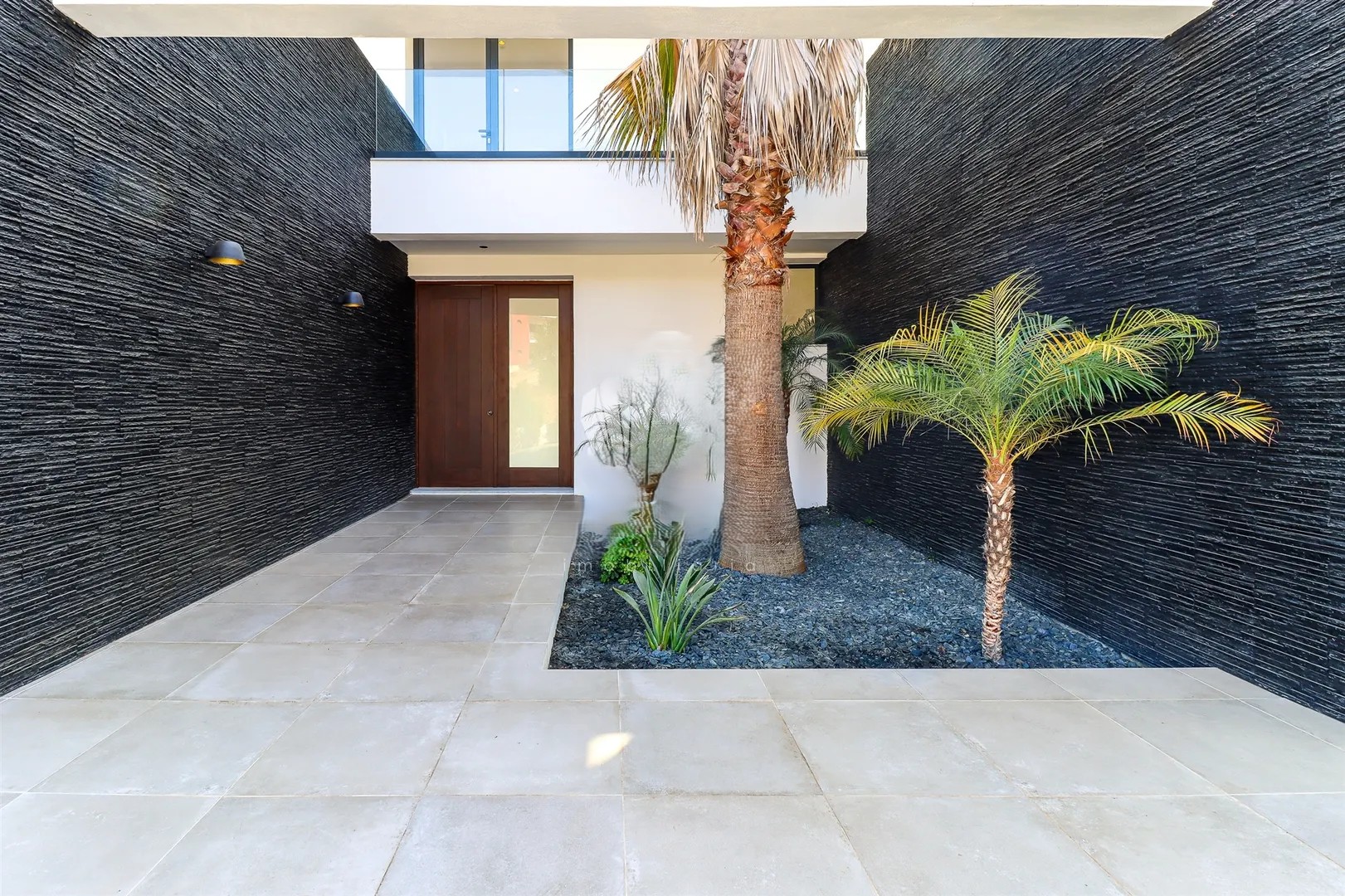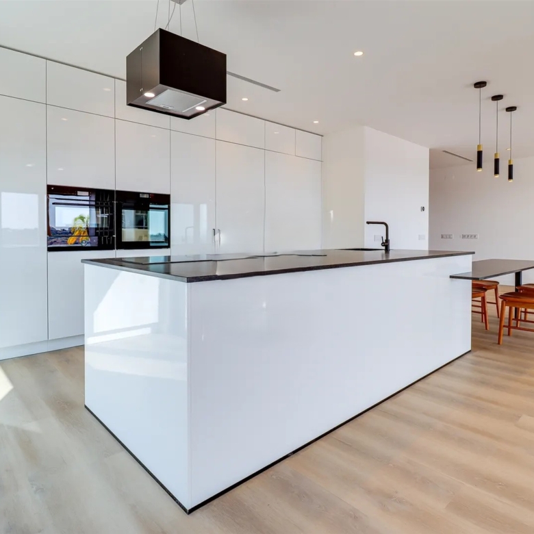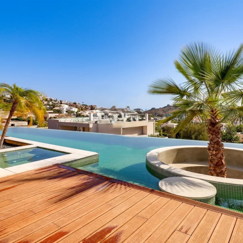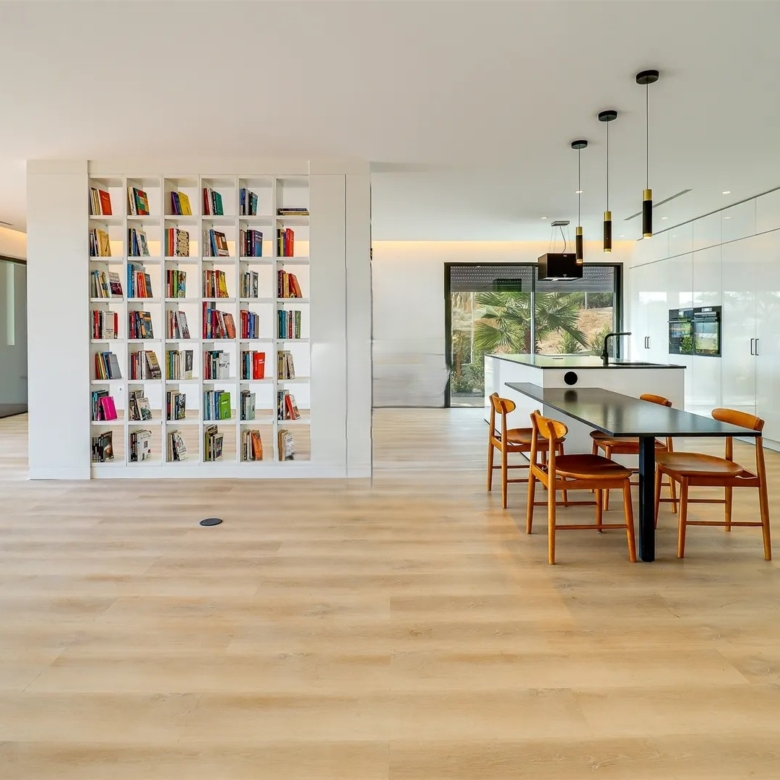 It has an imposing entrance to the social area, with a living and dining room and kitchen equipped with an open-plan island, very spacious, with natural light thanks to the glass windows that extend from floor to ceiling, thus offering a panoramic view over the sea and the tropical garden, eliminating any barrier between the interior and the exterior. This perfect fusion between the spaces allows for a continuous experience, where the huge terrace, the pool and the jacuzzi become a natural extension of the interior area of the house.