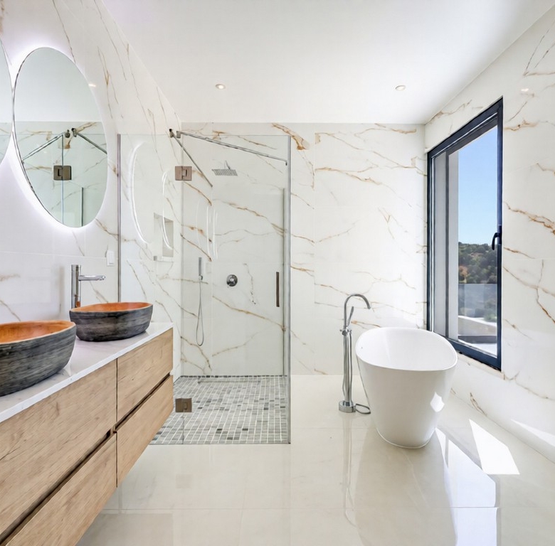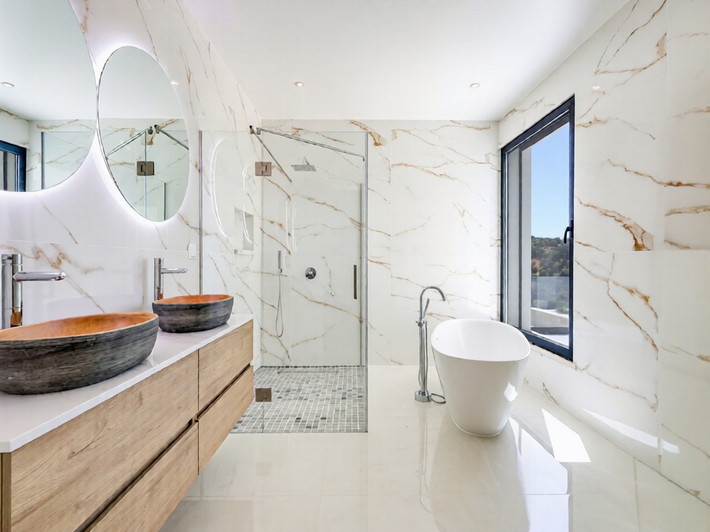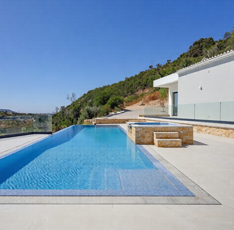 Outside, there is an impressive infinity pool with a jacuzzi, providing a perfect setting to relax and enjoy the panoramic views of the garden.
