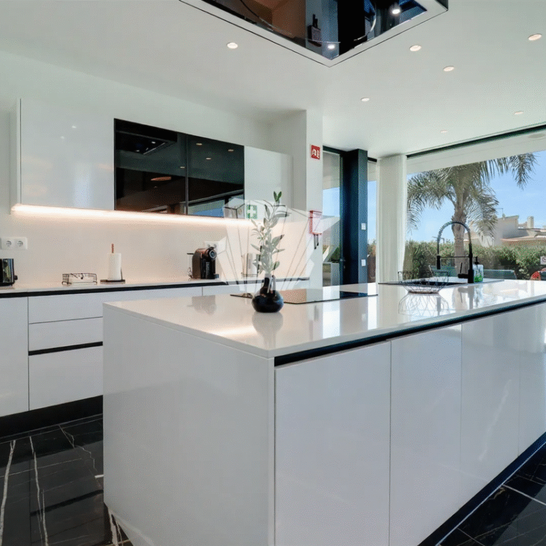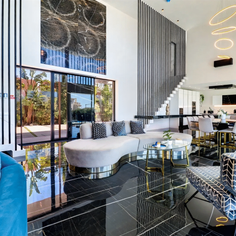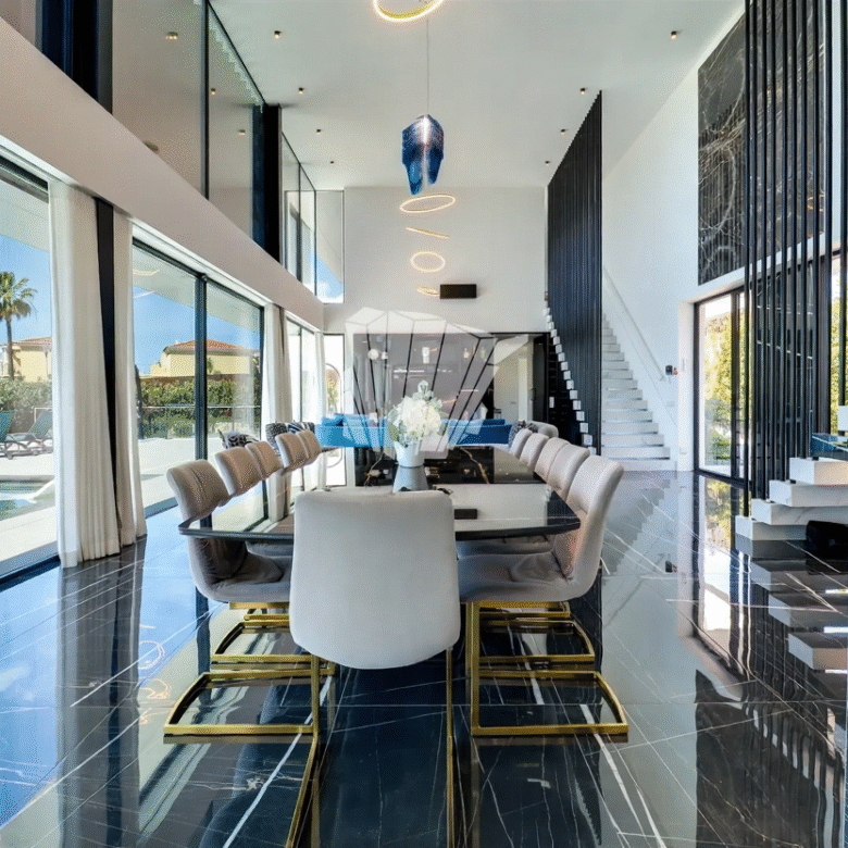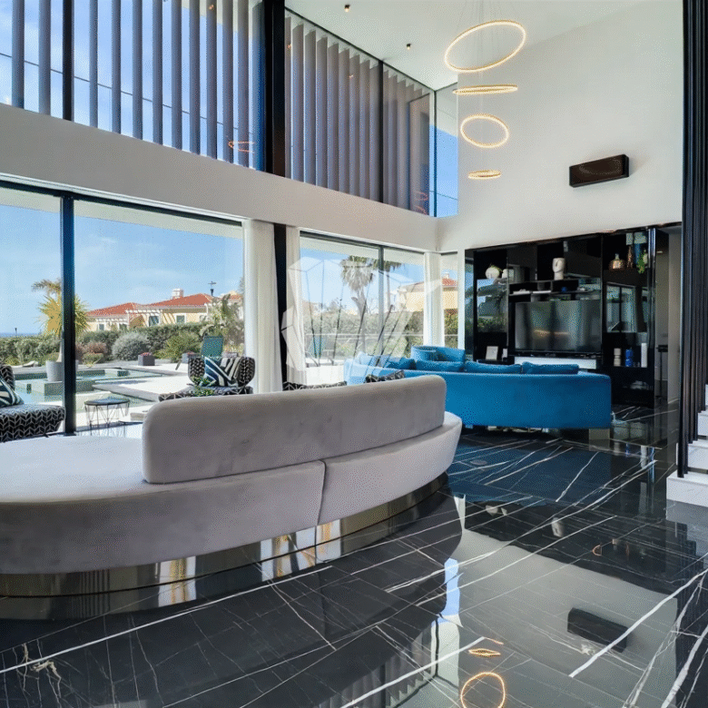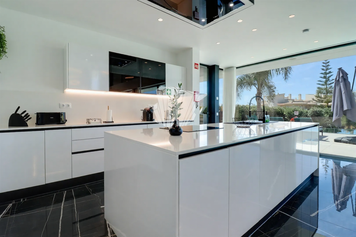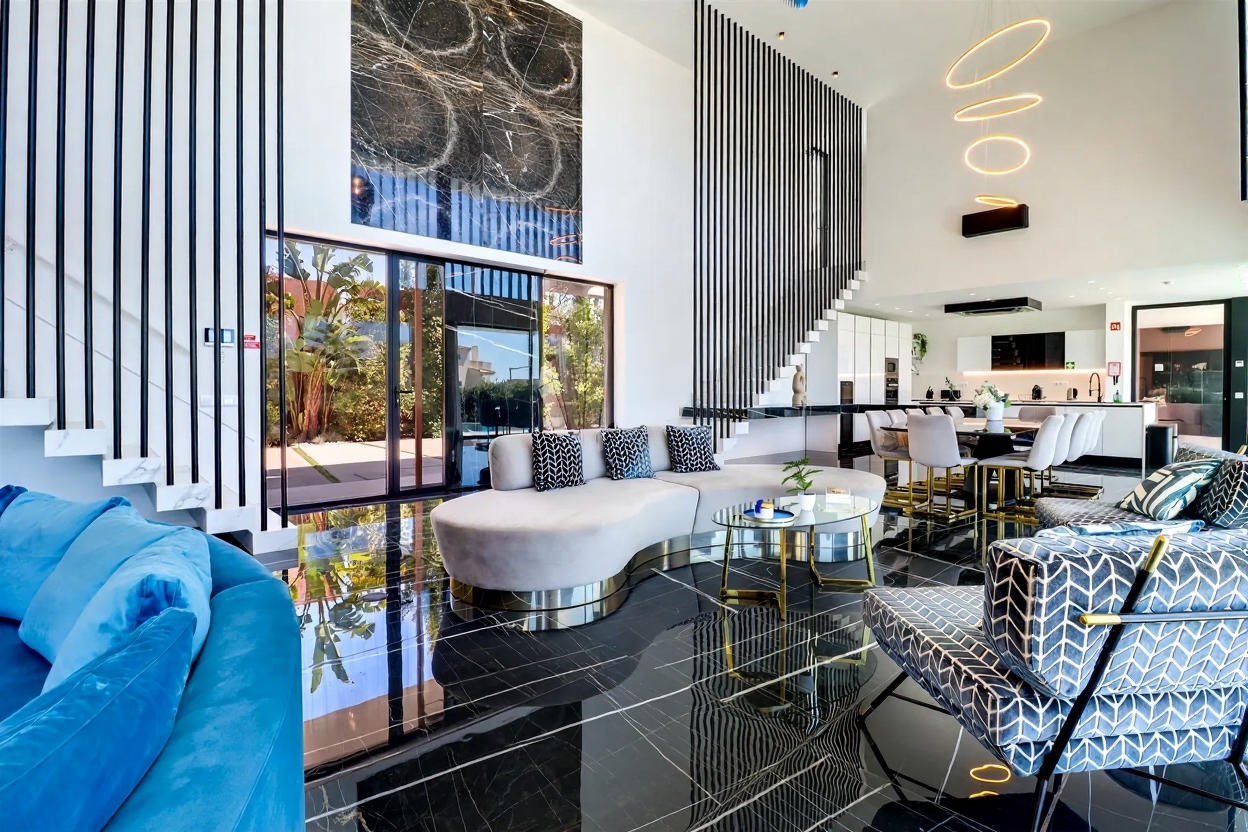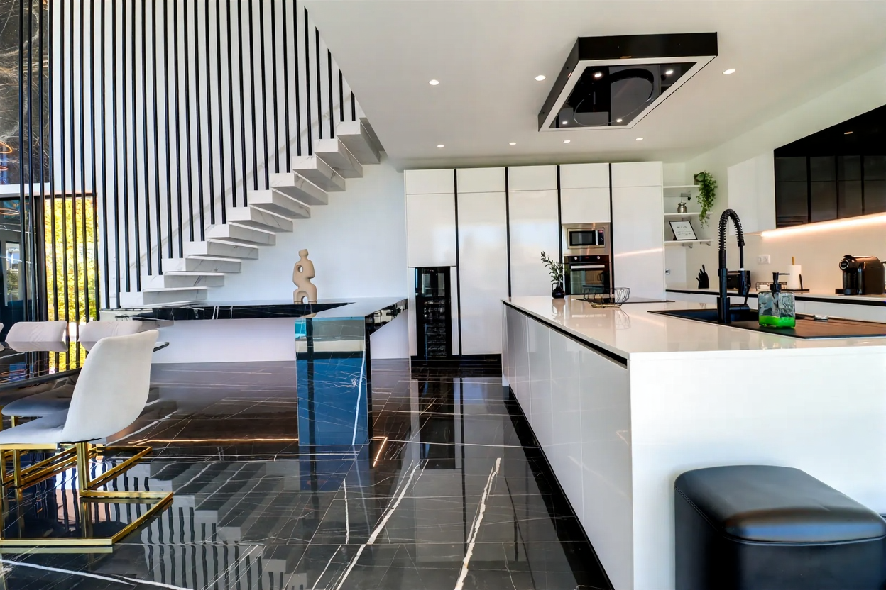 Upon entering, you are greeted by a spacious open plan living and dining room, with an elegant illuminated double staircase. The panoramic views of the sea, the high ceilings that enchant at first glance and the wide sliding glass doors that open onto the magnificent saltwater pool and the outdoor recreation areas create an unparalleled sense of freedom.