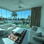 When you walk into the living room, you immediately get what this place is about. There’s this nice mix of overhead lighting and a statement chandelier that gives it a luxurious feel without being over the top. The grey marble-look flooring runs throughout, which I think is a smart choice – it looks sophisticated but it’s also practical for a place this close to the beach.