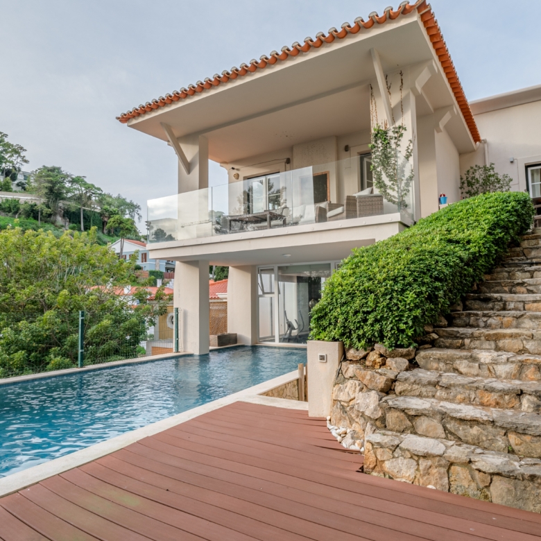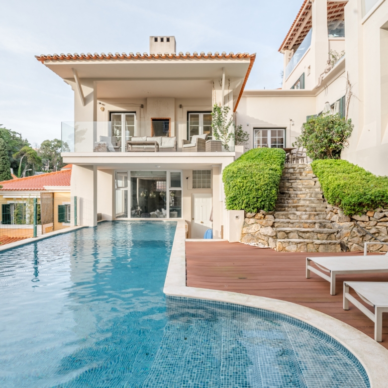 6-bedroom villa, with 290 sqm of gross construction area, with a swimming pool, located on a 332 sqm plot of land in Estoril, Cascais. The villa is composed of three floors. The entrance hall has a suite, and on the -1 floor, there is a social area with three spaces: a living room with a fireplace, a dining room with access to a terrace, and a small TV room that communicates with the kitchen. In the kitchen area, there is a dining area, a pantry, and a maid’s room with a private bathroom. In the more private area of the house, there is the master suite and two bedrooms with a complete support bathroom. On the -2 floor, there is a studio/gym/games room with a view of the pool, a bathroom, and a cellar. This area has an independent entrance from the rest of the villa.The house is a 10-minute walk from Vale de Sta. Rita and Praia da Poça. It is a 2-minute drive from the German School of Estoril, 5 minutes from Salesianos do Estoril, and 20 minutes from St. Julian’s International Schools, 15 minutes from TASIS Portugal International School and Carlucci American International School of Lisbon. It is 10 minutes away from the town of Cascais and a 30-minute drive from the center of Lisbon and Humberto Delgado Airport.