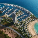 The East Tower is located at the commercial hub of the marina offering a vibrant and bustling environment for residents and guests. Its spacious lobby has an undulating sculptural ceiling soaring 12 meters above the floor and is surrounded by an all-glass exterior curtain wall with structural glass mullions. This allows an abundance of natural light to flow in and offers a direct view of the commercial area and Event Centre.