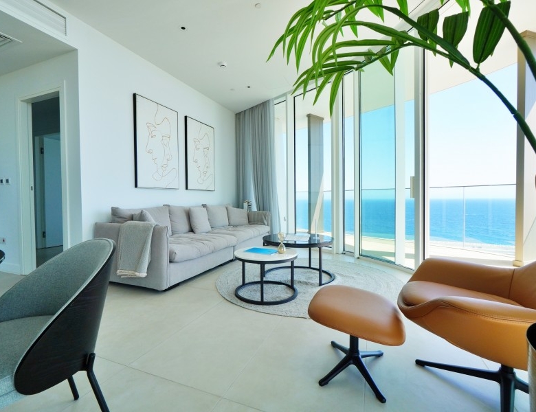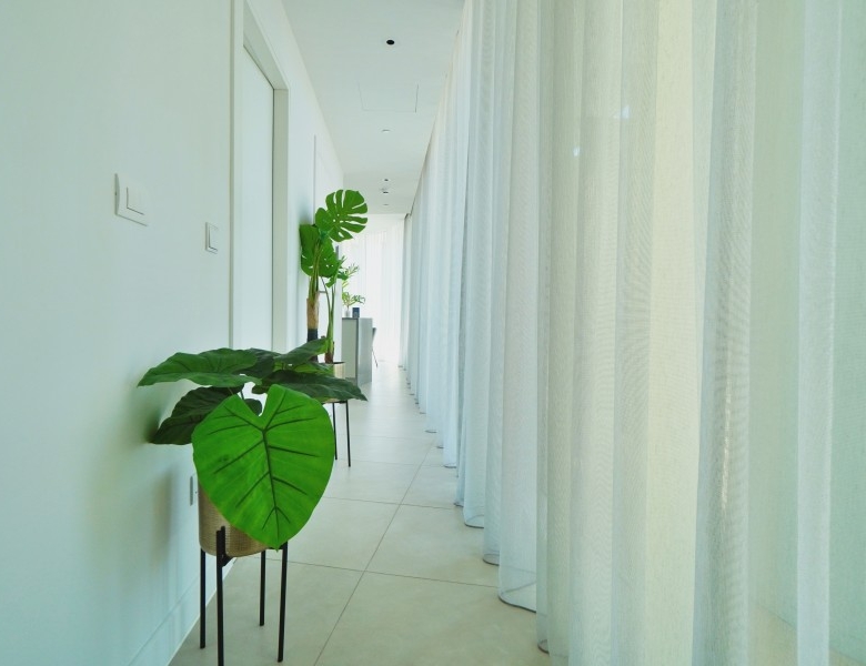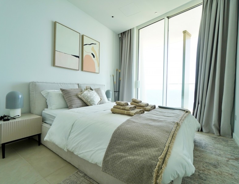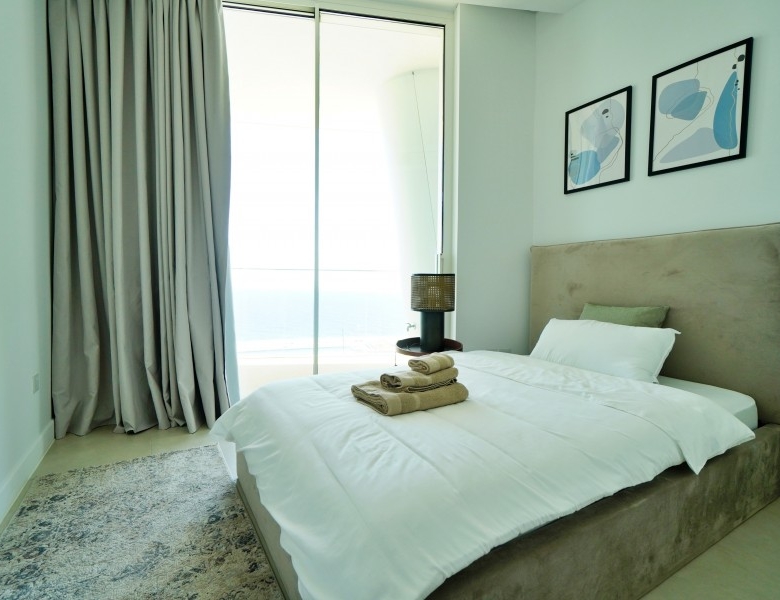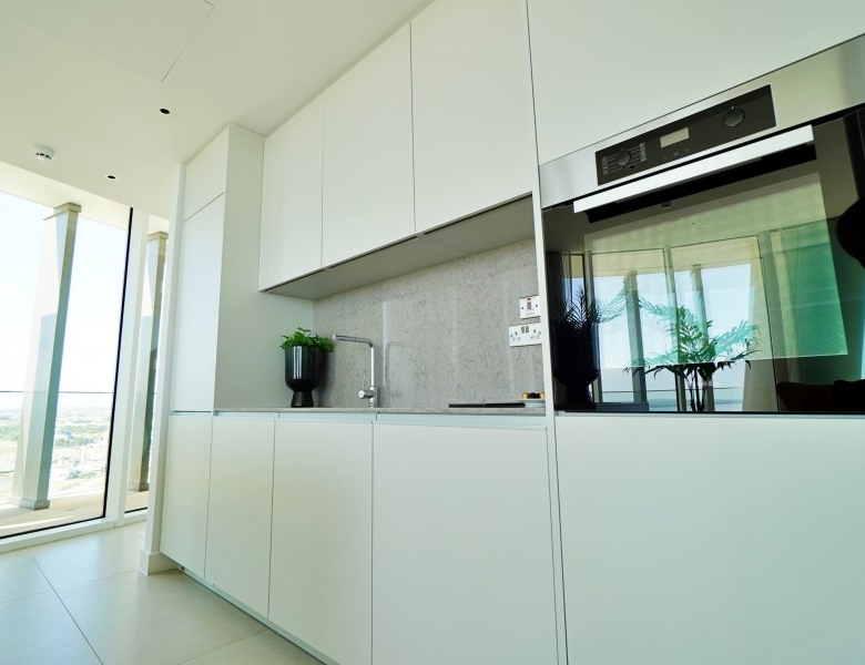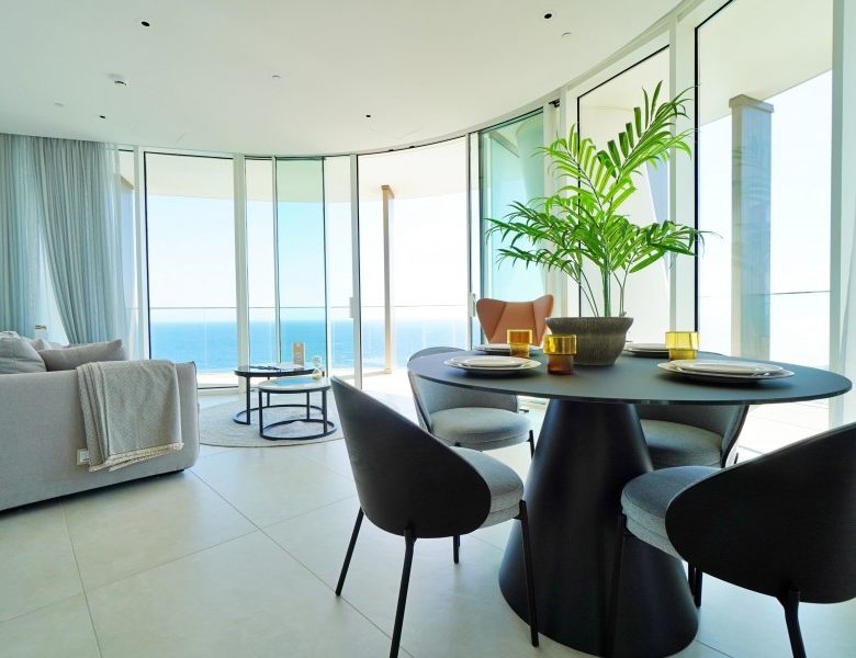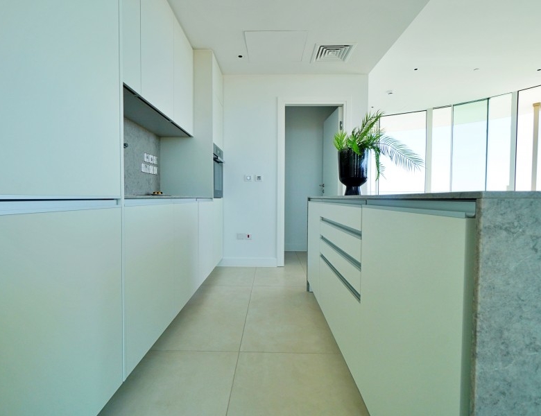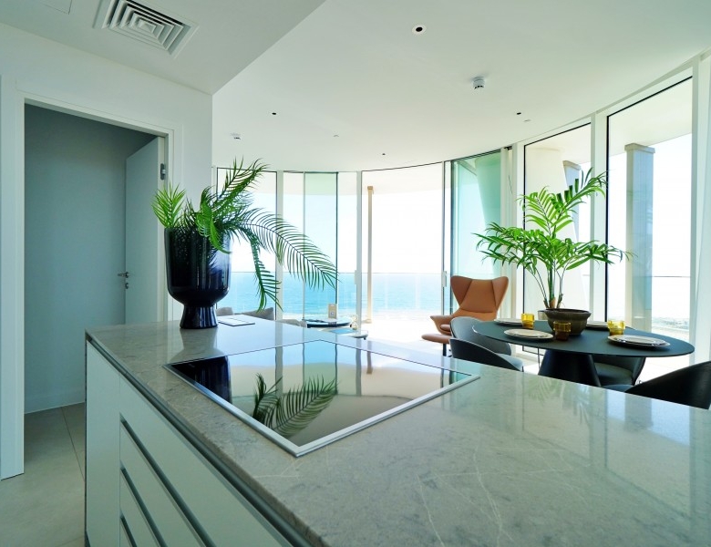 The East Tower is located at the commercial hub of the marina offering a vibrant and bustling environment for residents and guests. Its spacious lobby has an undulating sculptural ceiling soaring 12 meters above the floor and is surrounded by an all-glass exterior curtain wall with structural glass mullions. This allows an abundance of natural light to flow in and offers a direct view of the commercial area and Event Centre.