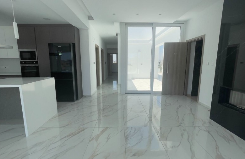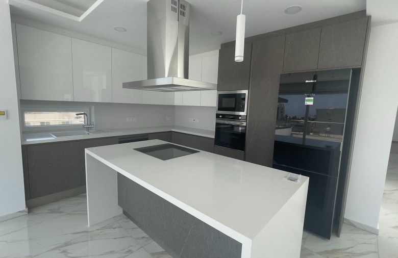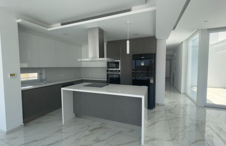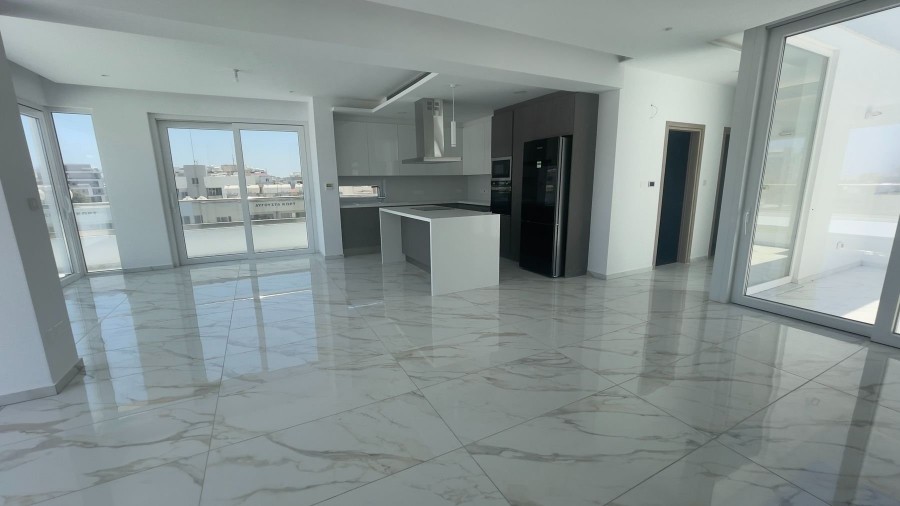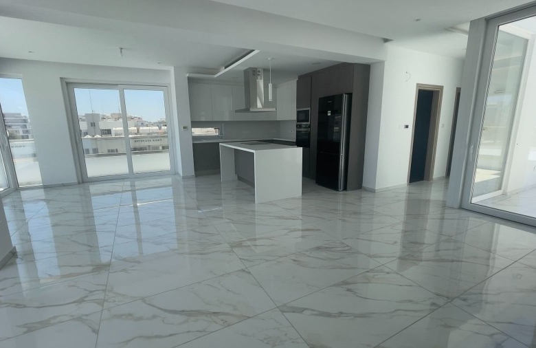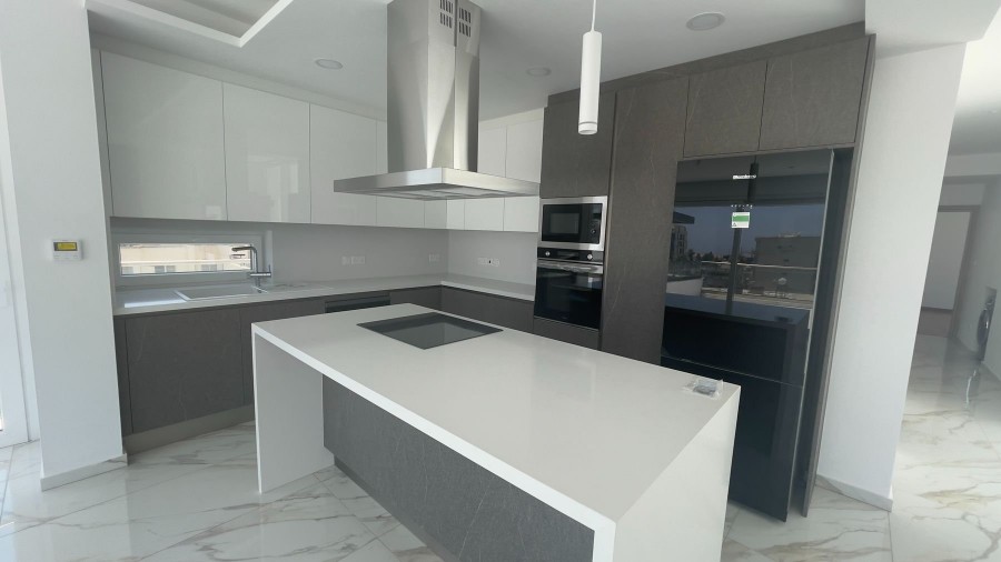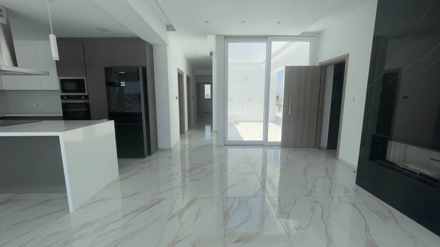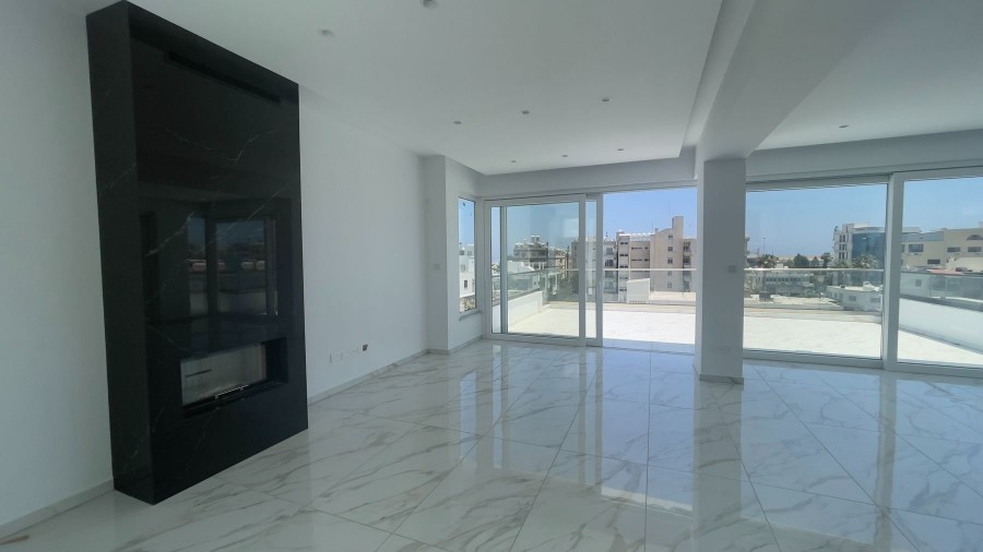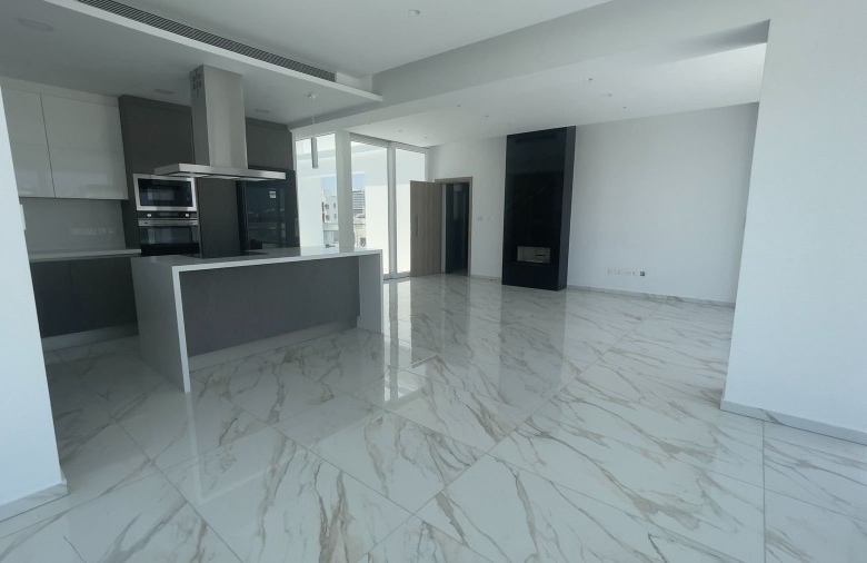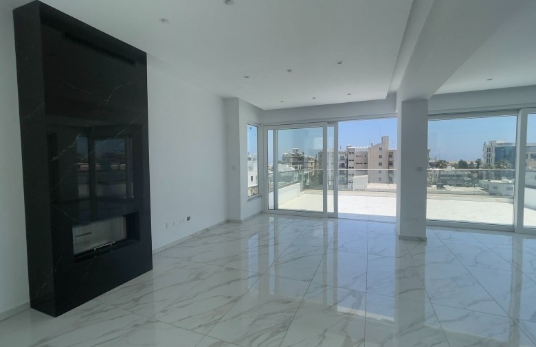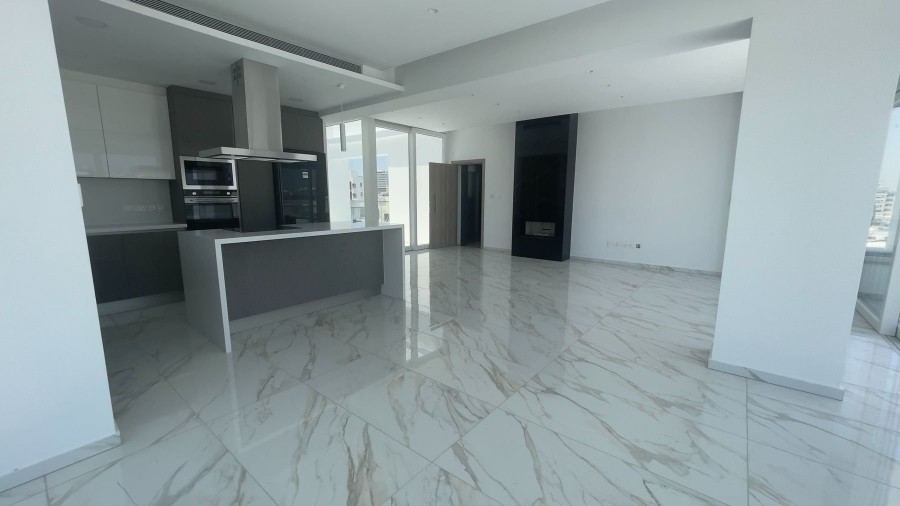 Luxurious 4th-floor apartment with 3 bedrooms, 2 bathrooms, guest WC, spacious living room, and sleek Italian kitchen. Features include marble flooring, indoor fireplace, high ceilings, double glazing, modern design, and a large balcony with stunning city views. Conveniently located near bus routes, amenities, and main roads. Modern facilities include central air-conditioning, underfloor heating, solar photovoltaic panels (5kVA), smart home technology, elevator access, and 2 covered parking spaces.