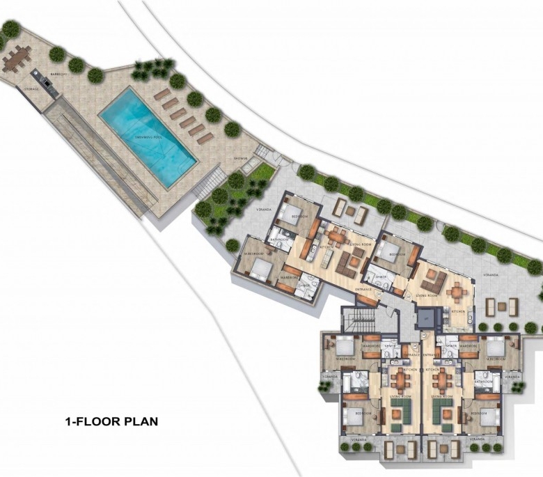Each apartment boasts an open-plan living room and a fully equipped kitchen, providing a spacious and comfortable environment. There are two bedrooms with built-in wardrobes, including a Master Bedroom with its own wardrobe and en-suite shower room. The apartments also include a shared bathroom, as well as a built-in closet in the hallway that accommodates a washing and drying machine.