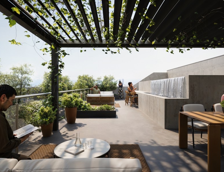 The common rooftop area offers a variety of facilities, including a swimming pool and gym, as well as dining, lounge, and co-working spaces designed for both relaxation and productivity.
