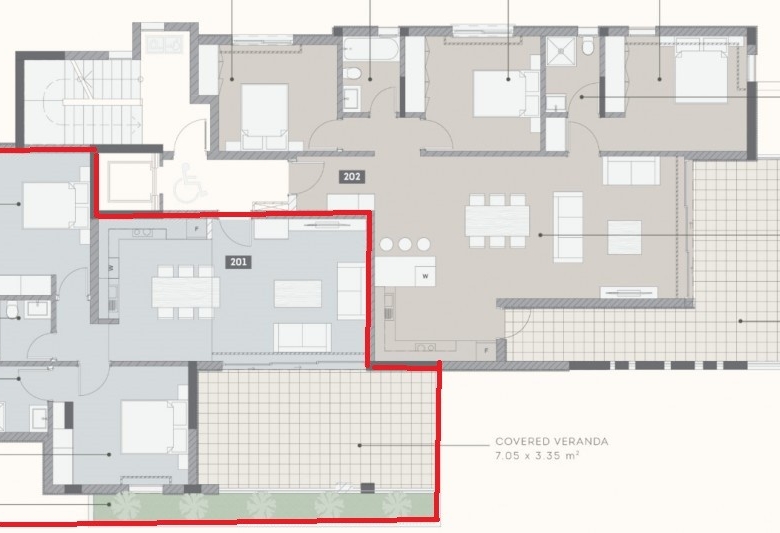 Each apartment in this complex is a unique combination of elegant, spacious and comfortable layouts, where the main thing is the space for the whole family in a large living room with a kitchen area, as well as a covered terrace with greenery.