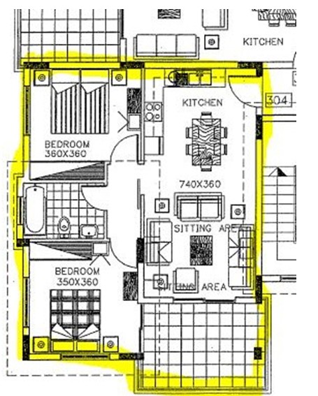 The two-bedroom apartment of 95sqm with open plan kitchen dining ad living room area.