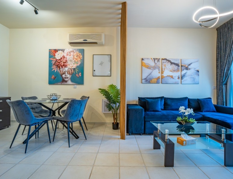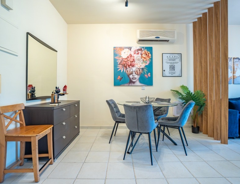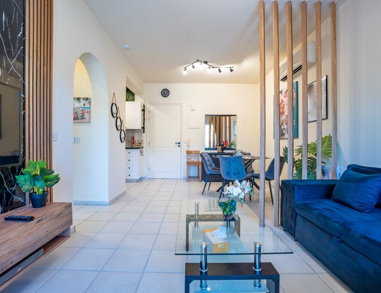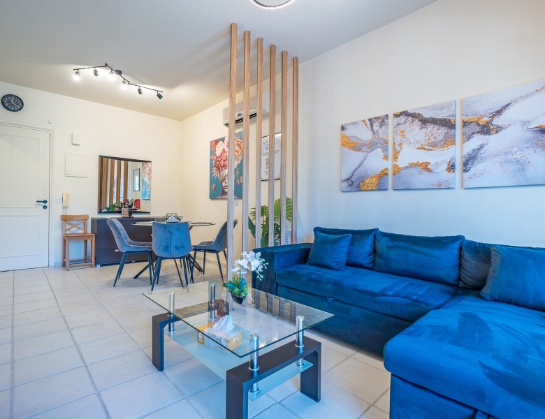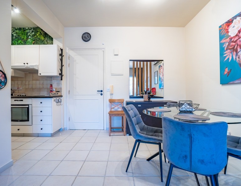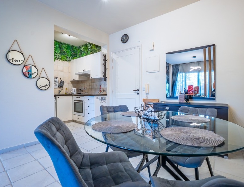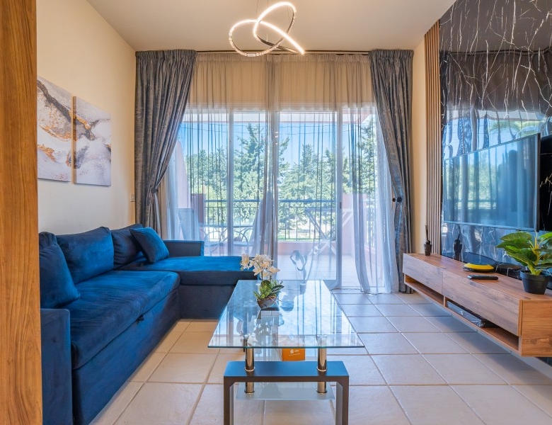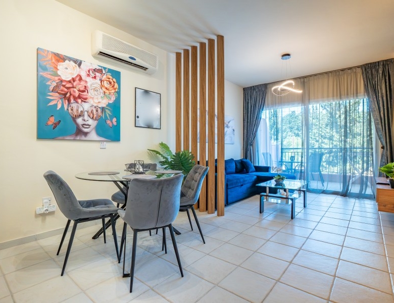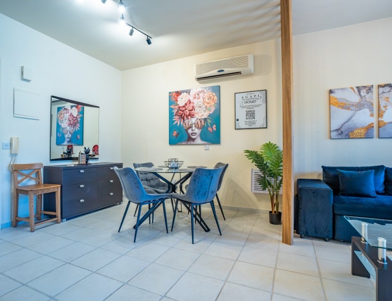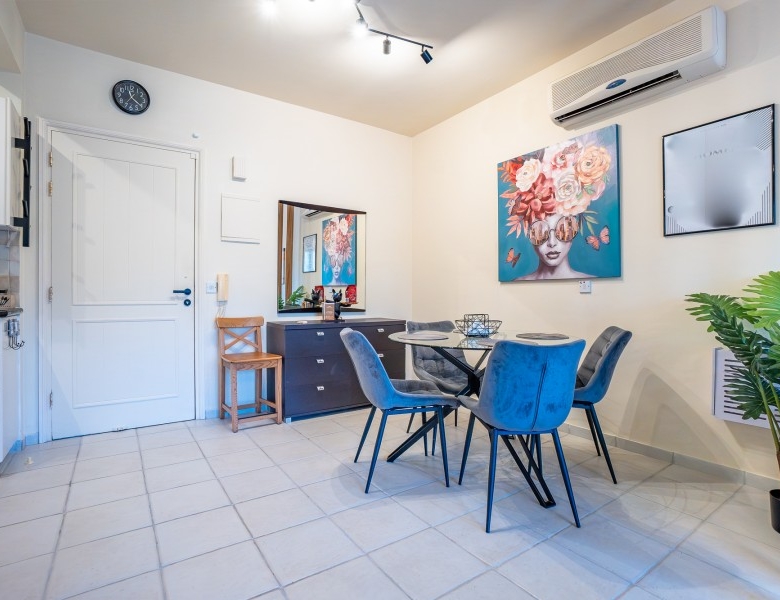 The apartment features a bright open-plan living and dining area, a fully equipped kitchen, and a spacious bedroom with ample storage. Large patio doors lead out to a private balcony, ideal for relaxing with a morning coffee or enjoying the warm Cypriot evenings.