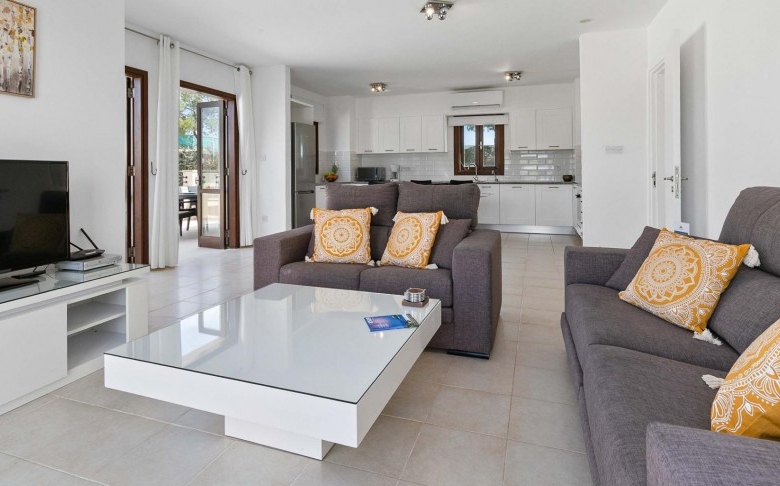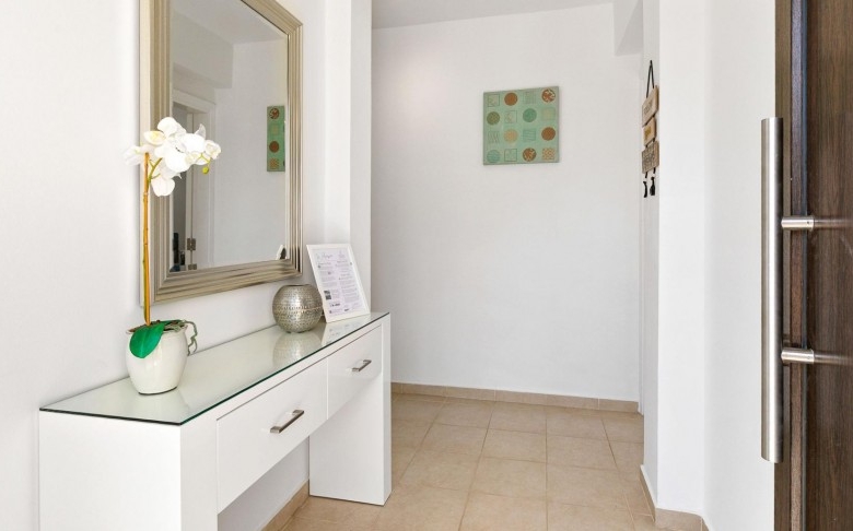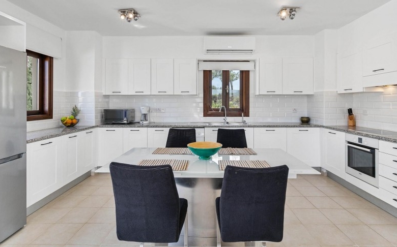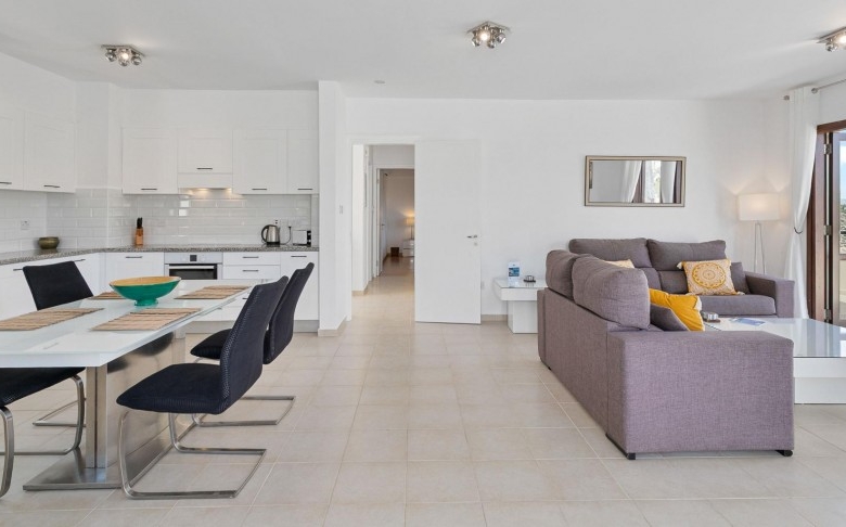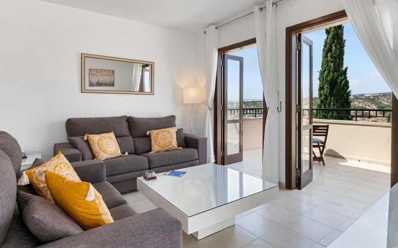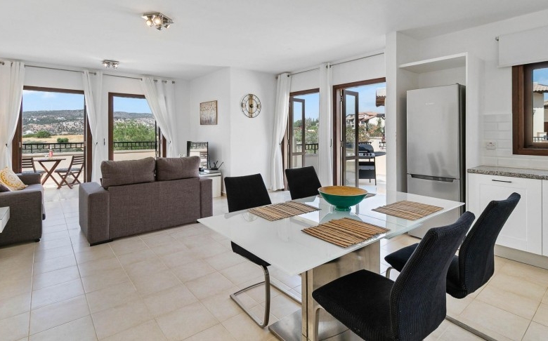 This fantastic two-bedroom apartment is located in the beautifully landscaped Zephyros Village, close to the free-form communal swimming pool and is part of the Award-Winning Aphrodite Hills Resort. The apartment is located on the first floor and is tastefully decorated in neutral tones with contrasting flashes of colour on the soft furnishings and has modern fixtures and fittings throughout. The apartment has a large modern kitchen constructed from Italian wood and comes complete with all kitchen appliances. The large open plan living, dining and kitchen areas feature beautifully tiled floors and experience tremendous light through its many French doors. Three Large terraces can be enjoyed when exiting the living & dining areas as well as the master bedroom of the property offering panoramic views and certainly is one of the main highlights of this remarkable property.