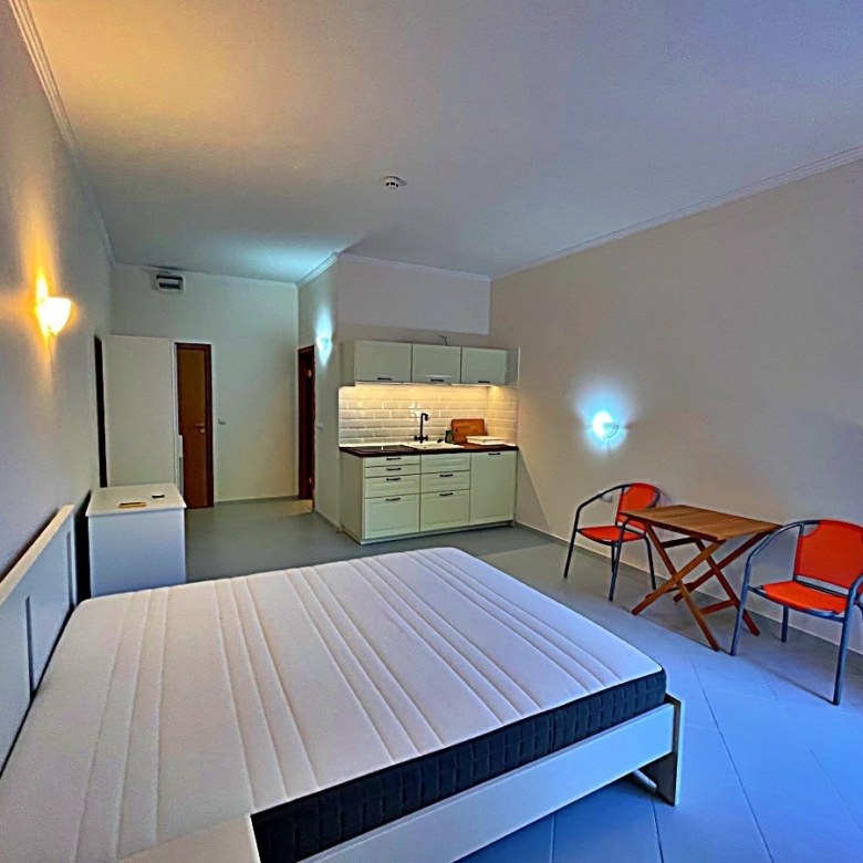 The living area of 39 m² is functionally divided and provides everything needed for a comfortable stay. The apartment features a compact kitchenette equipped with essential appliances – perfect for preparing small meals. A dining table with chairs offers space for two people.