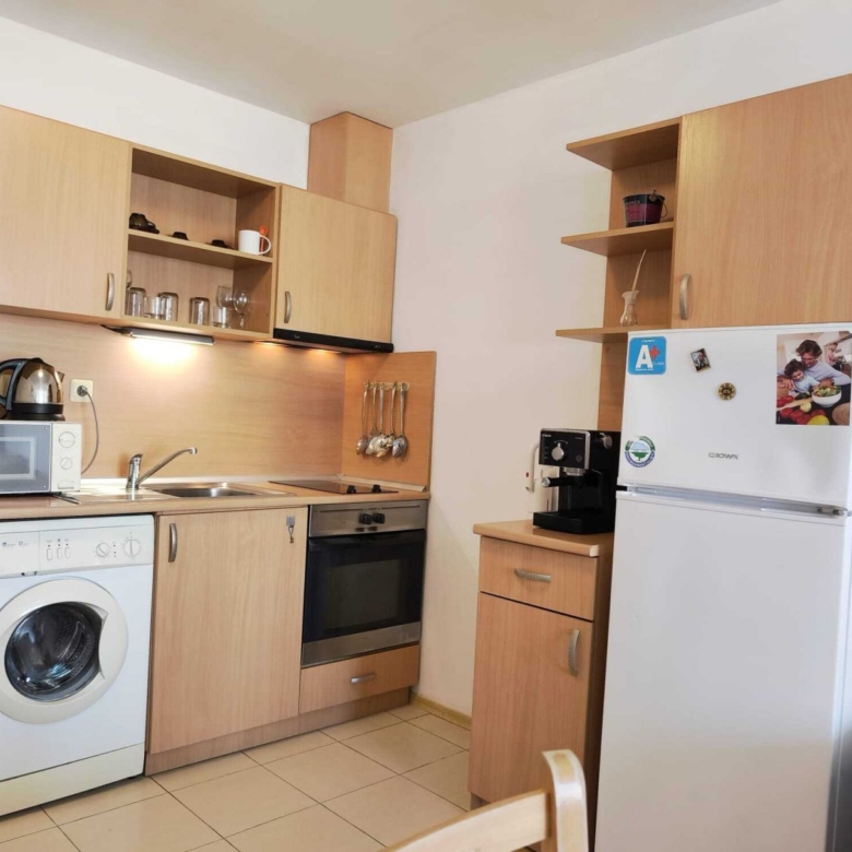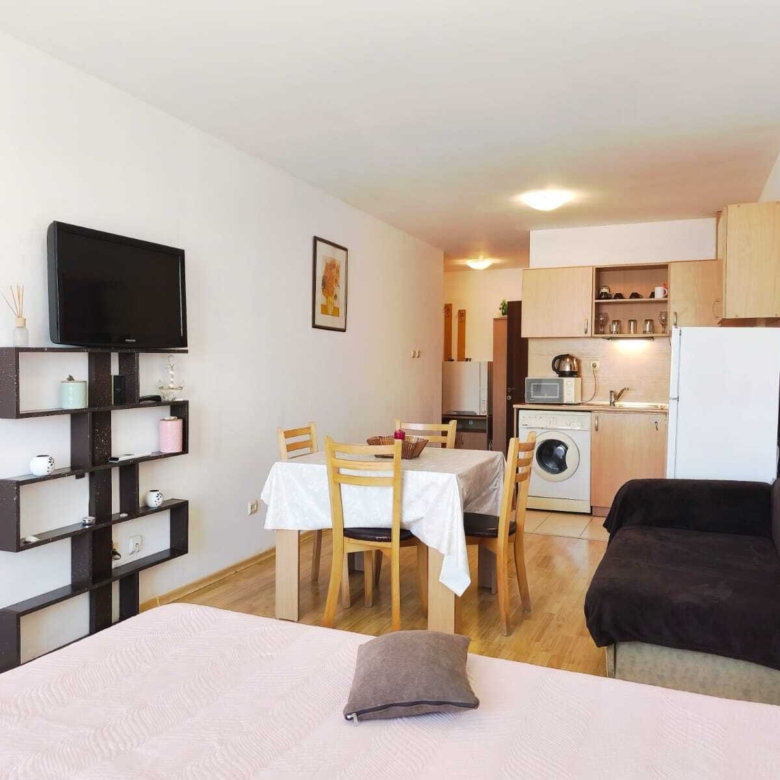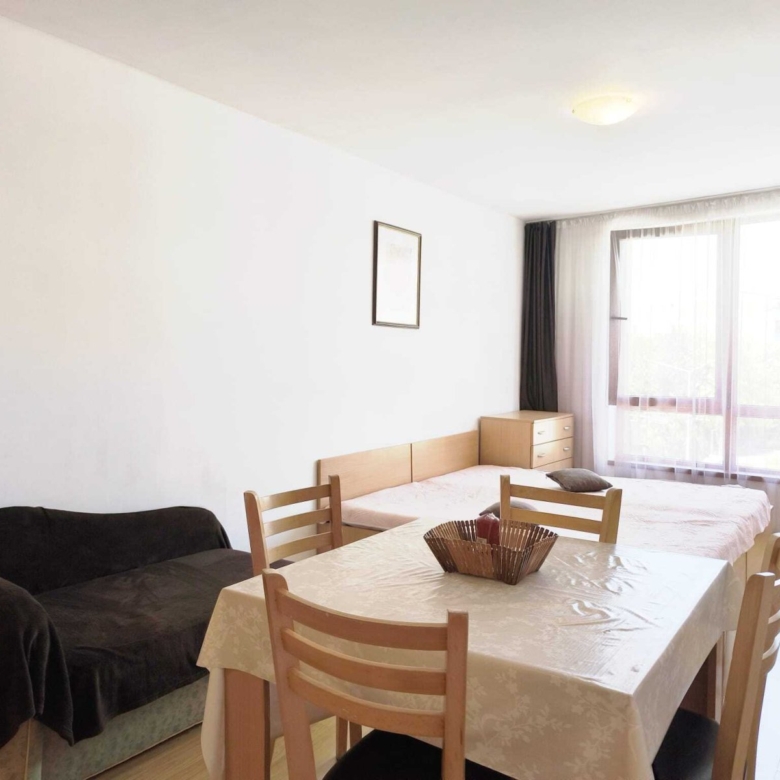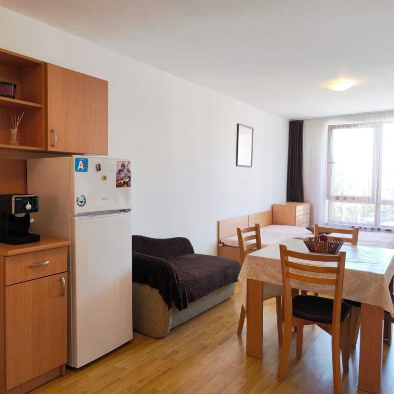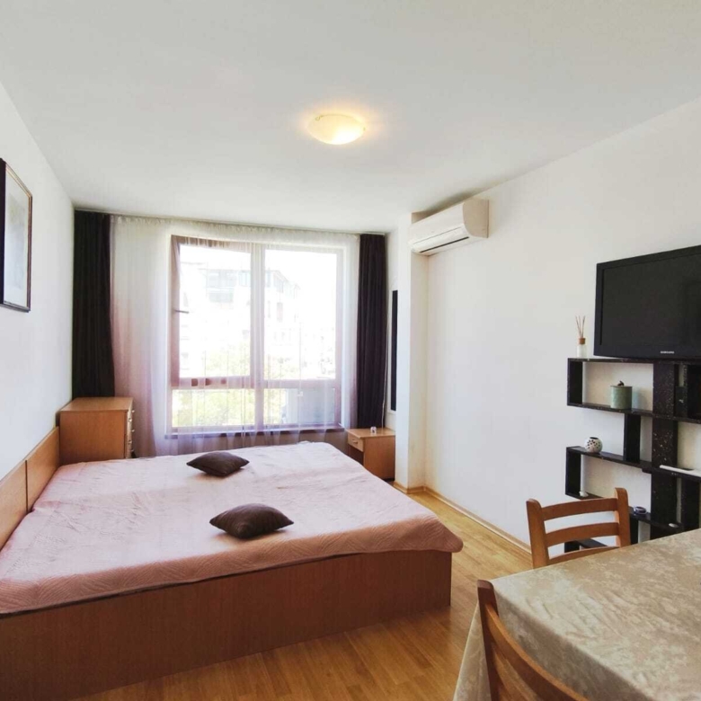 Fully furnished 1-room apartment in Nessebar, Vigo residential complex, 3rd floor, 43 m². No annual maintenance fee. Price: EUR65,000. Ideal for vacation or investment.