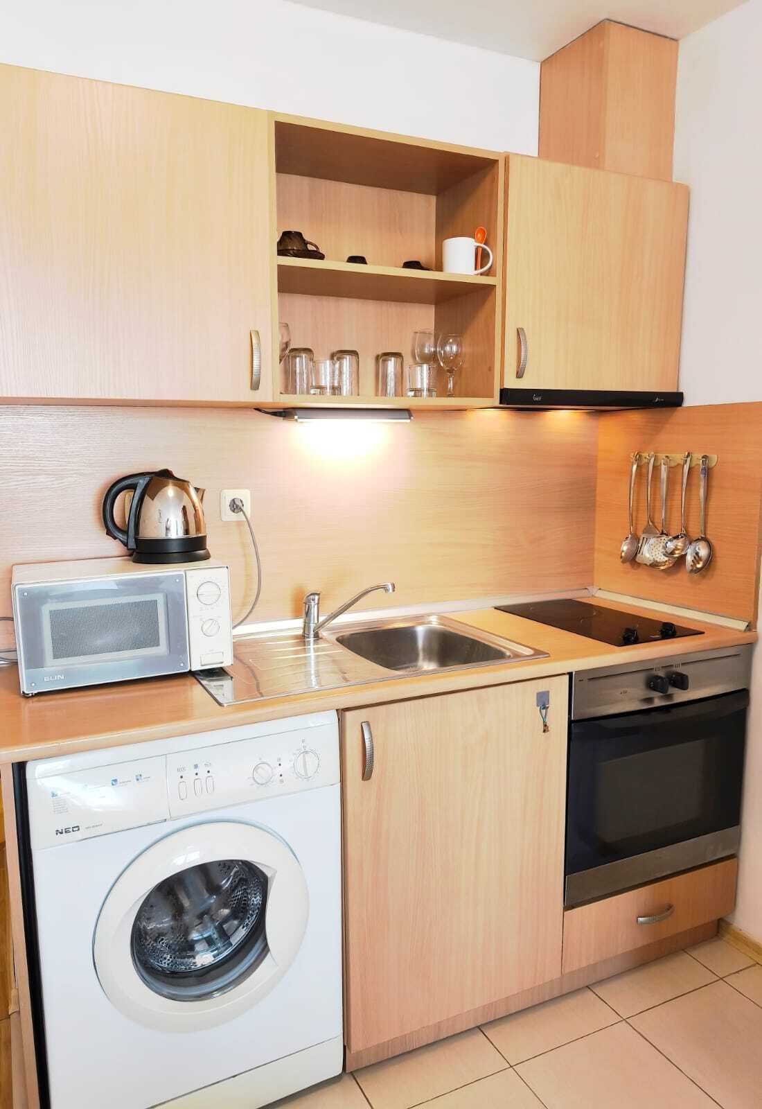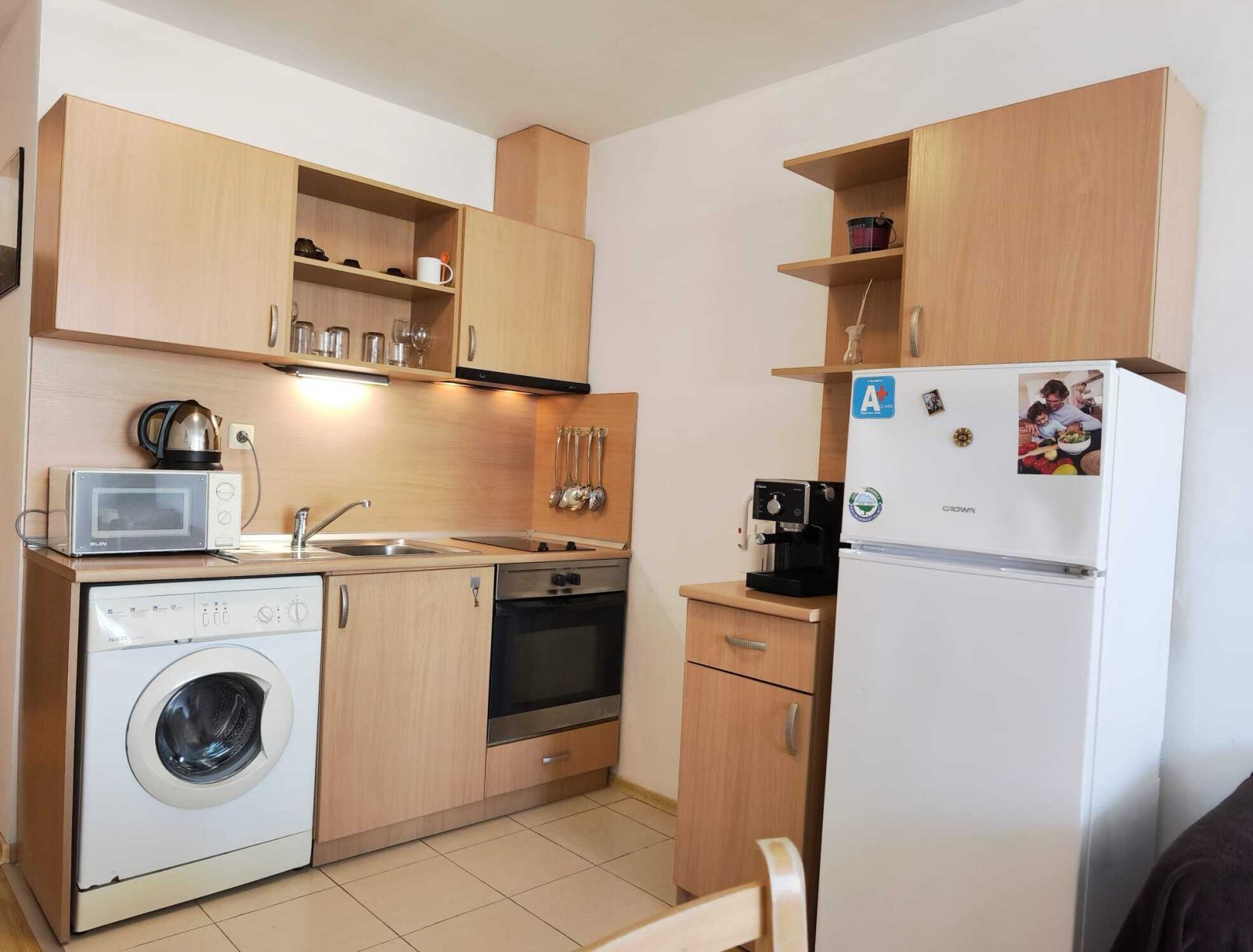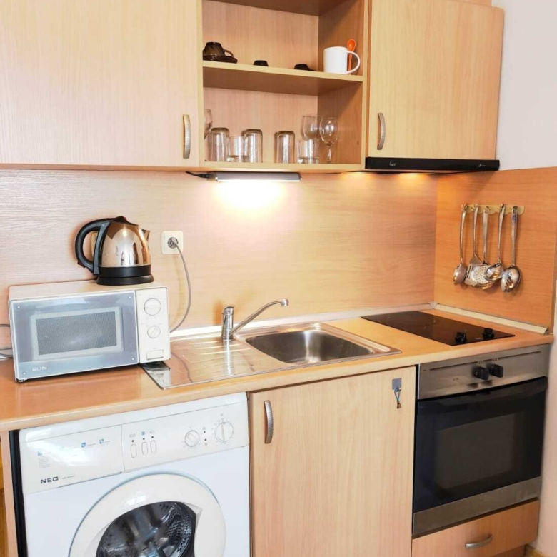 The high-quality fitted kitchen leaves nothing to be desired: equipped with an electric stove, oven, microwave, washing machine, refrigerator with freezer compartment, kettle, and coffee machine.