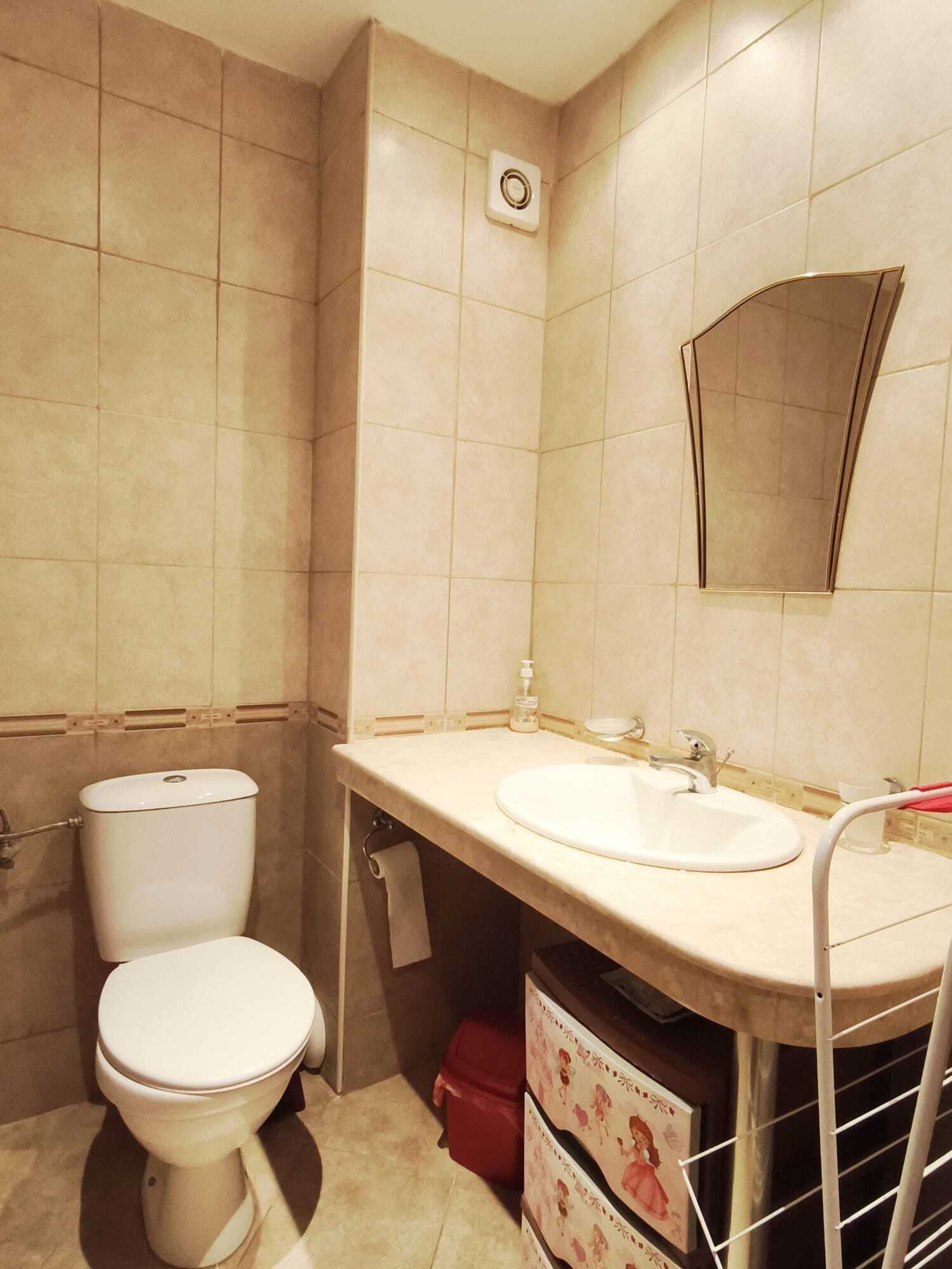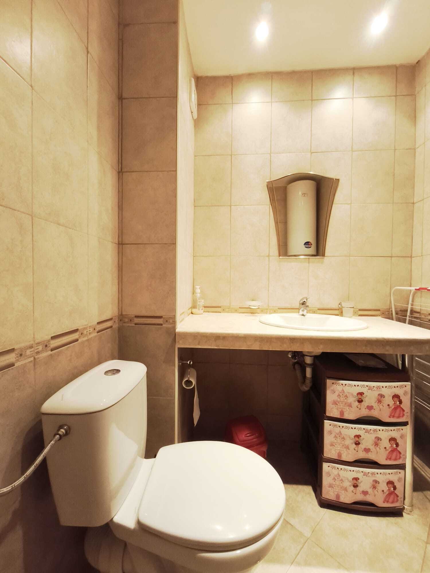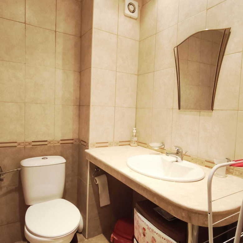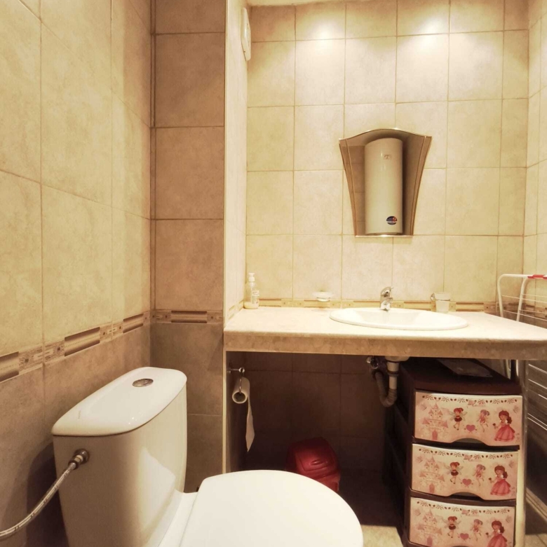 The spacious bathroom offers comfort and functionality with a sink, toilet, mirror, hot water boiler, and plenty of storage space.