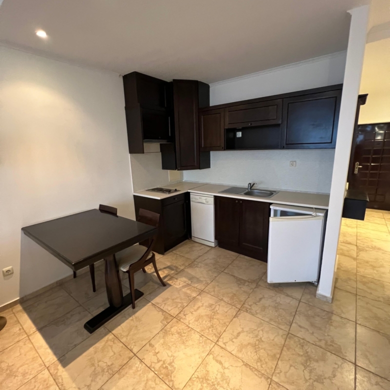The apartment is very functional and consists of a large living room with a separate dining area and a kitchenette equipped with a refrigerator and a dishwasher, air conditioning, a sleeping area with a sofa and coffee table, a bathroom with a toilet and a bathtub, and a terrace with a beautiful view of the sea and the pool.