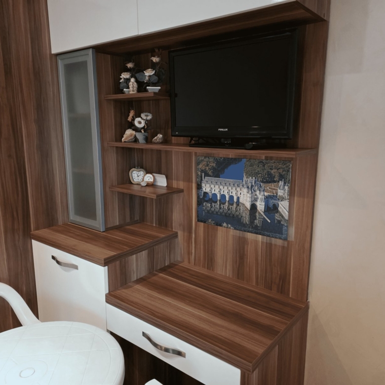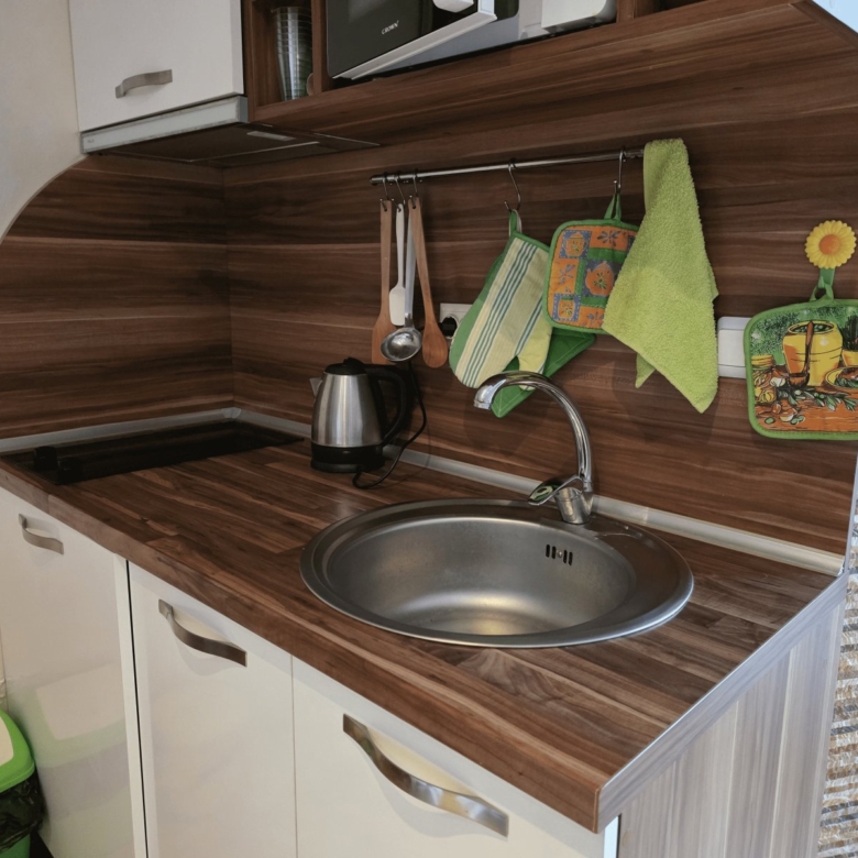 It is fully furnished with a sofa bed, a double bed, a wardrobe, and a small kitchenette with a refrigerator.